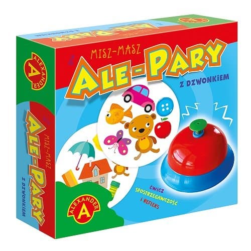 „Ale Pary z Dzwonkiem - MISZ MASZ” to szalona zabawa na spostrzegawczość. Gra składa się z 31 kart, z 6 obrazkami na każdej z nich. Dwie dowolne karty mają po jednym wspólnym obrazku (ale często różnej wielkości). Gra polega na jak najszybszym znalezieniu wspólnego obrazka. Kto pierwszy zobaczy wspólny obrazek na swojej karcie i karcie leżącej na środku stołu uderza w dzwonek i wypowiada nazwę obrazka. Następnie odkłada swoją kartę na wierzch stosu. Zabawa jest świetnym treningiem analizy wzrokowej, umiejętności postrzegania, rozróżniania szczegółów i refleksu. Rekwizyt w postaci dzwonka, który kochają wszystkie dzieci. Dwa warianty zabawy. Wiek graczy: 4+ L:iczba graczy: 2-4