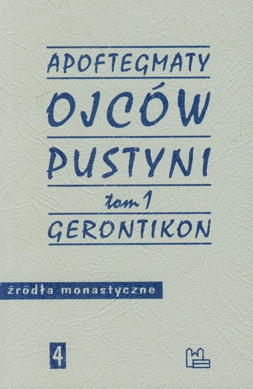 Pierwszy tom apoftegmatów opublikowany w serii „Źródła monastyczne” obejmuje Gerontikon, czyli Kolekcję Alfabetyczną wraz z gruntownie przepracowanym komentarzem i wstępami z wydania w PSP. Z przyczyn technicznych pominięto bibliografię, którą zamieszczono w drugim tomie apoftegmatów, czyli w przekładzie Kolekcji Systematycznej. W drugim wydaniu pierwszego tomu ograniczyliśmy się jedynie do nielicznych korekt samego przekładu oraz poprawienia indeksów. Od czasu pierwszego wydania Kolekcji Alfabetycznej, ukazały się drukiem inne, ważne dla historii monastycyzmu starożytnego dzieła: Pisma ascetyczne św. Bazylego, Dzieje miłości Bożej. Historia mnichów syryjskich Teodoreta z Cyru, Opowiadania dla Lausosa Palladiusza z Helenopolis, Żywoty mnichów Pawła, Malchusa i Hilariona św. Hieronima, Pachomiana latina, dwa tomy Pism ascetycznych Ewagriusza z Pontu oraz pierwszy tom Rozmów z Ojcami Jana Kasjana. Wydaje się więc, że dzieło podjęte przez ks. Sebastiana Piskorskiego ponad trzysta lat temu jest kontynuowane. Chociaż ciągle jeszcze nie możemy się pochwalić, że przełożyliśmy wszystkie utwory, które ów wielki krakowski tłumacz przetłumaczył samodzielnie. Usilnie pracujemy nad tym, by jak najszybciej mu dorównać. Abba Makary Wielki; kiedy w Sketis odprawiał braci po zgromadzeniu, mawiał: „Bracia, uciekajcie”. Jeden ze starców go zapytał: „Dokąd jeszcze mielibyśmy uciekać z tej pustyni?” A on położył palec na usta, mówiąc: „Od tego uciekajcie”. I poszedł do swojej celi, zamknął drzwi i tak pozostał.