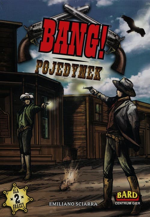 Stróżowie prawa i bandyci w końcu stanęli na udeptanej ziemi, bitwa będzie pełna niespodzianek! Każda ze stron ma dwóch rewolwerowców w walce naraz: Jednego na froncie, a drugiego w odwodzie. Jeżeli sprytnie będziesz manewrować ich ustawieniem i używał mądrze ich umiejętności na pewno wygrasz pojedynek... a twoi przeciwnicy będą gryźli piach! Bang! Pojedynek jest dwuosobową wersją gry Bang!, w której każdy z graczy wybiera określoną liczbę bohaterów z osobistej talii: stróżów prawa lub bandytów. Im większą liczbę bohaterów wybierzemy, tym dłuższa będzie rozgrywka. Każdy gracz rozpoczyna grę z dwoma bohaterami, stojącymi ramię w ramię, jeden obok drugiego. Każdy gracz posiada także swoją osobistą talię akcji – stróże prawa specjalizują się w dobieraniu kart, a bandyci w stosowaniu sztuczek. Gracze na zmianę zagrywają karty tak, aby wyeliminować wrogie postacie z gry. Wygrywa ten, kto pierwszy wyeliminuje wszystkie postacie przeciwnika. BANG! Pojedynek to samodzielna gra z serii BANG!. Nie potrzebujesz klasycznej gry BANG! do gry. Zawartość pudełka: 80 kart gry, 24 postacie, 1 karta przygotowania do gry, 4 karty skrótu zasad, 2 zetony aktywnej postaci, 20 zetonów kul, instrukcja.