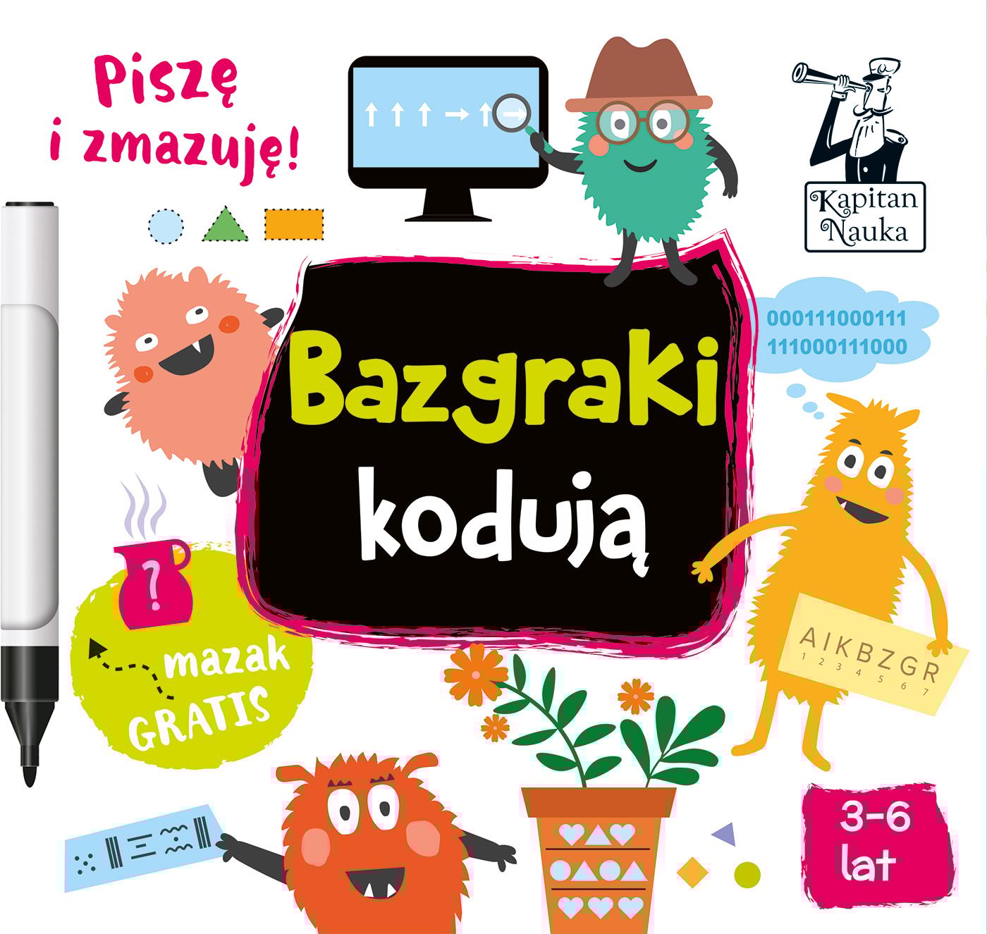 Bazgraki kodują (3–6 lat) to wciągające zabawy z podstaw programowania dla przedszkolaków. Dzięki różnorodnym szyfrom, rebusom i zagadkom dzieci uczą się tworzyć proste algorytmy, uzupełniać sekwencje oraz kodować informacje za pomocą symboli graficznych. Sympatyczne Bazgraki i ich pomysły sprawiają, że kodowanie staje się fascynującą przygodą i wyzwaniem przygotowującym do nauki matematyki, informatyki i robotyki. Tajniki kodowania offline Wraz z sympatycznymi Bazgrakami przedszkolaki podejmują mnóstwo wyzwań, m.in. odczytują zaszyfrowane hasła, kodują trasy podróży za pomocą symboli, tworzą algorytmy parkowania i zapisują swoje imię w języku maszyny kodującej. Ćwiczą przy tym myślenia logiczne, percepcję wzrokową oraz uważność, która przyda się w pisaniu kodu. Polecenia opracowane przez Monikę Sobkowiak, nauczycielkę i neurologopedę, zostały tak przygotowane, by dziecko w nauce programowania widziało użyteczne możliwości i rozwijało nowy sposób uczenia się zgodnie z ideą STEM. To nowe podejście do nauki polegające na rozwiązywaniu problemów metodą prób i poprawek. Integruje ono nauki ścisłe, nowoczesne technologie, inżynierię oraz matematykę, by efektywniej myśleć oraz znajdować pomysły. Kolorowe ilustracje Poli Augustynowicz pobudzają dziecięcą ciekawość i wyobraźnię oraz motywują do nauki podstaw programowania offline. Książka „Bazgraki kodują” umożliwia niekończącą się zabawę – zmywalne karty i flamaster suchościeralny pozwalają na wielokrotne rozwiązywanie zadań, zachęcając do rozwijania nowego sposobu uczenia się metodą prób i poprawek. Rozwój kodowanie, myślenie logiczne, grafopercepcja, spostrzeganie wzrokowe Autorki: Monika Sobkowiak – nauczycielka wychowania przedszkolnego, neurologopeda, autorka artykułów, książek i zabaw dla dzieci. Nieustannie poszukuje kreatywnych rozwiązań edukacyjnych i sposobów na rozwijanie twórczego myślenia u dzieci w wieku przedszkolnym i wczesnoszkolnym. Prowadzi blog Pani Monia, inspirujący nauczycieli do innowacyjnego działania w edukacji. Pola Augustynowicz – ilustratorka i graficzka, obecnie mieszka i pracuje w Warszawie. Studiowała na Uniwersytecie Artystycznym w Poznaniu, a także dziennikarstwo na Uniwersytecie Adama Mickiewicza. Projektuje książki, tekstylia, opakowania, współpracuje z magazynami. Laureatka licznych konkursów graficznych i biennale. W serii również Bazgraki. Emocje Bazgraki i alfabet Bazgraki i dinozaury Bazgraki i liczby Bazgraki piszą i czytają Bazgraki w kosmosieSzczegółowe informacje na temat książki Bazgraki kodują