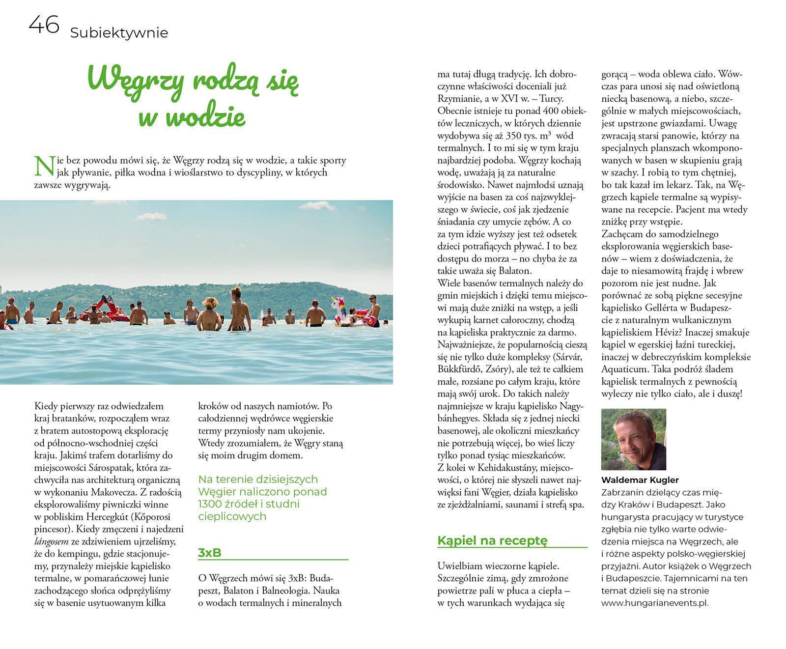 W kompleksach termalnych uwagę zwracają starsi panowie, którzy na specjalnych planszach wkomponowanych w basen w skupieniu poświęcają się grze w szachy. I robią to tym chętniej, bo tak kazał im lekarz. Tak, na Węgrzech kąpiele termalne są wypisywane na receptę. Pacjent może wówczas zakupić bilet ze zniżką.