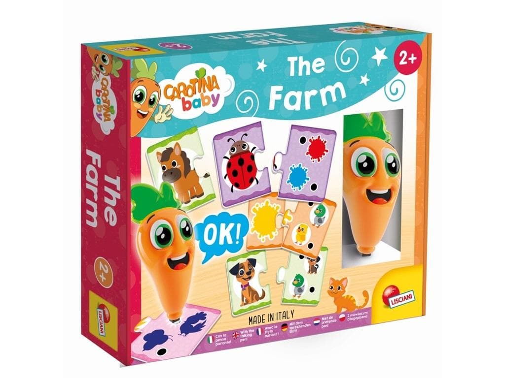 Interaktywny produkt do poznawania farmy przez zabawę w formie quizów. Dzieciom towarzyszy Carotina, która przy każdej poprawnej odpowiedzi radosnymi okrzykami zachęca dzieci do dalszej zabawy. Elementy wykonane z grubej i odpornej na ślinę tektury pozwalają najmłodszym lepiej poznać farmę dzięki logicznym skojarzeniom.