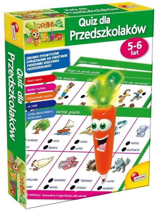 Carotina Quiz dla przedszkolaków 5-6 lat - to liczne zagadnienia dydaktyczne. W nauce dziecku pomoże mówiąca i świecąca marchewka, która pochwali je za dobrą odpowiedź. Zestaw zawiera 30 kart do stopniowej nauki różnych zagadnień, Carotinę oraz instrukcję.