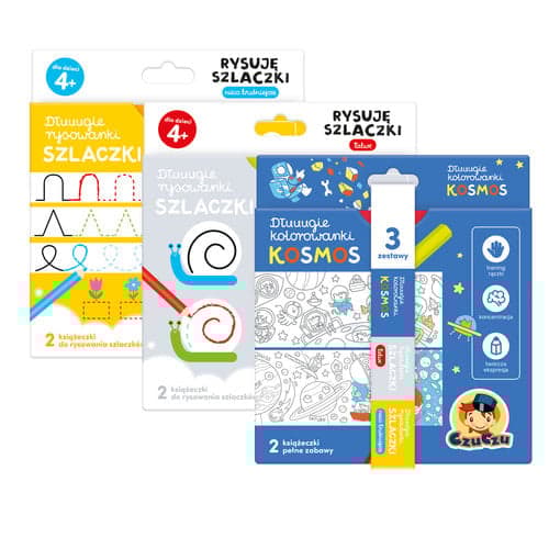 Kreatywny zestaw zawiera 3 tytuły: Dłuuugie rysowanki Szlaczki Łatwe, Dłuuugie rysowanki Szlaczki Nieco trudniejsze oraz Dłuugie kolorowanki Kosmos. To w sumie 6 długich książeczek harmonijek z mnóstwem kreatywnych i edukacyjnych zadań.