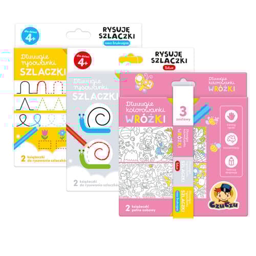 Kreatywny zestaw zawiera 3 tytuły: Dłuuugie rysowanki Szlaczki Łatwe, Dłuuugie rysowanki Szlaczki Nieco trudniejsze oraz Dłuugie kolorowanki Wróżki. To w sumie 6 długich książeczek harmonijek z mnóstwem kreatywnych i edukacyjnych zadań.