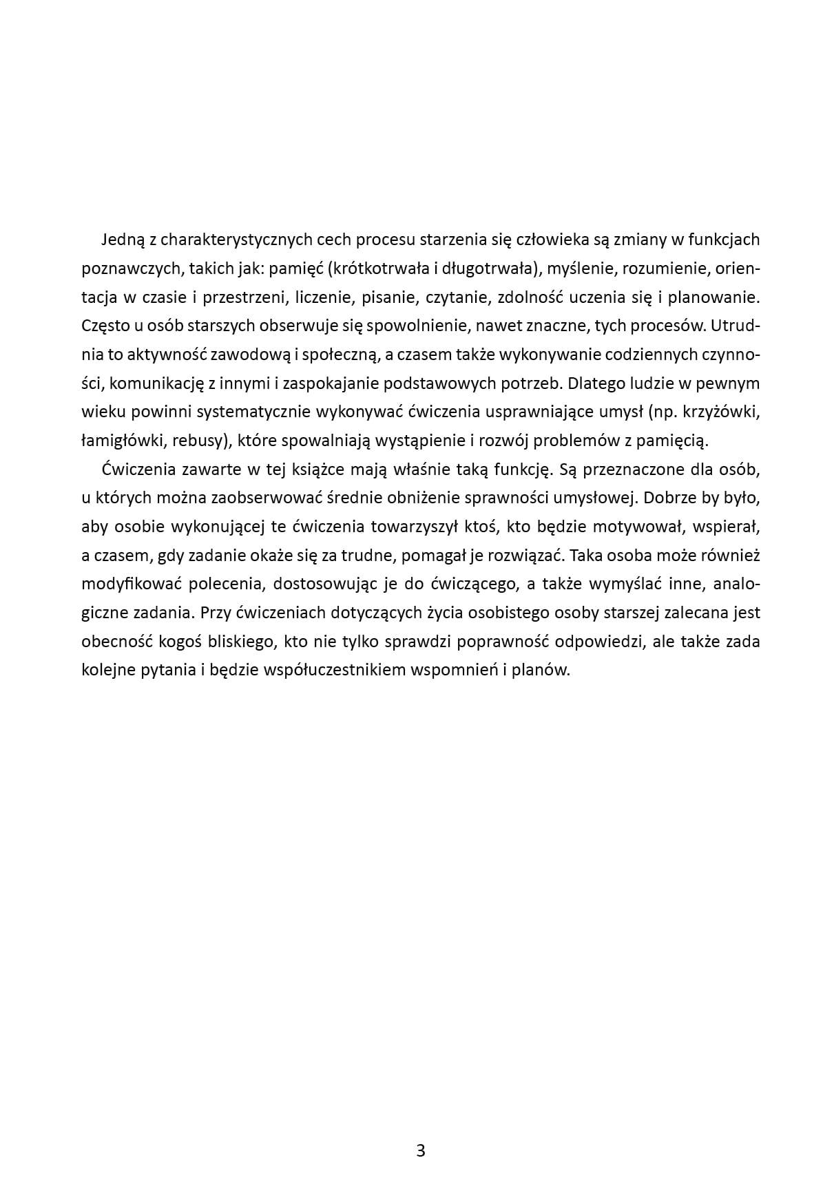 Ćwiczenia zawarte w tej książce przeznaczone są dla osób starszych, u których nastąpiło znaczne obniżenie sprawności umysłowej będące wynikiem starzenia się lub różnych chorób. Rozwiązywanie proponowanych łamigłówek i zadań spowolni rozwój problemów z pamięcią, myśleniem, rozumieniem, orientacją w czasie i przestrzeni, liczeniem, pisaniem, czytaniem i planowaniem. Niektóre pytania dotyczą życia osobistego, zmuszając do wspominania dawnych czasów (np. dzieciństwa, lat szkolnych) lub wydarzeń mających miejsce niedawno (np. uroczystości rodzinnych), a także utrwalania w pamięci ważnych informacji takich jak adres czy numer telefonu.Szczegółowe informacje na temat książki Demencja To nie dla mnie! Poziom średni Ćwiczenia percepcji i pamięci dla osób w podeszłym wieku