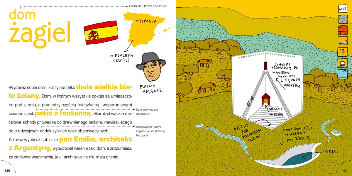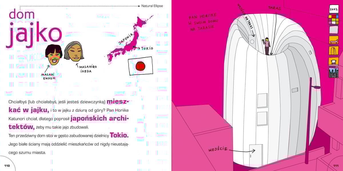 Pomysłowa i zabawna książka, z której młodzi czytelnicy dowiedzą się, jak bardzo różne mogą być ludzkie domy i jak fascynującą sztuką jest architektura. Dowcipne, soczyście kolorowe rysunki i zwięzłe, przystępne opisy prezentują 35 niezwykłych domów stworzonych przez najwybitniejszych architektów świata.