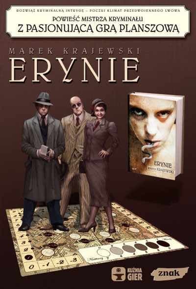 Wydawnictwo Znak wraz z Kuźnią Gier opracowało grę planszową Erynie, opartą na bestsellerowej powieści mistrza polskiego kryminału Marka Krajewskiego pod tym samym tytułem. Gra jest częścią specjalnego pakietu dla wielbicieli mocnych wrażeń zawierającego ponadto powieść oraz przewodnik informacyjny Makabryczna zbrodnia wstrząsnęła Lwowem.  Gra planszowa Erynie przeznaczona jest dla 3 do 5 osób. Każdy z graczy wciela się w rolę śledczego, który ma swojego głównego podejrzanego o zbrodnię oraz głównego niewinnego i poszukuje dowodów na ich winę bądź niewinność. Akcja gry - jak w powieści - toczy się we Lwowie. Jest rok 1939. Miastem wstrząsa seria makabrycznych zbrodni. Strach jest wszechobecny, wybucha panika. Na miasto pada cień erynii - bogiń zemsty. Do pracy rusza cała lwowska policja, na której czele stoi Edward Popielski - komisarz do zadań specjalnych. Gracze wcielają się w postacie śledczych. Mają oni rozwiązać kryminalną zagadkę: zebrać dowody i doprowadzić do ukarania winnych. Grę wygrywa ten gracz, którego podejrzenia najlepiej się sprawdzą.  Erynie to niewątpliwie wciągająca gra - pozwala przenieść się do 1939 roku, stanąć w szranki z najlepszymi lwowskimi glinami i uwolnić miasto od zbrodni. Przedwojenny klimat podkreślają piękne ilustracje Katarzyny Oleskiej.   Gra zawiera: planszę przedstawiającą przedwojenny Lwów, 12 kart winy i niewinności, 6 kart podejrzanych przedstawiających ich kartoteki policyjne, 6 znaczników śledczych wraz z podstawkami, 52 żetony, w tym 45 żetonów dowodów, 6 żetonów podejrzanych i 1 żeton śledztwa, oraz instrukcję. Cały pakiet (zawierający książkę, przewodnik i grę) zapakowany jest w pudełko i zafoliowany. Atrakcyjna szata graficzna sprawia, że idealnie nada się na prezent.   Kuźnia Gier to wydawnictwo specjalizujące się w tworzeniu i wydawaniu gier planszowych, karcianych i RPG, takich jak: Wiedźmin: Przygodowa Gra Karciana, Wiochmen Rejser, Inwigilacja, Kapitan Bomba, Kingpin, Wolsung: Magia Wieku Pary czy Veto!.