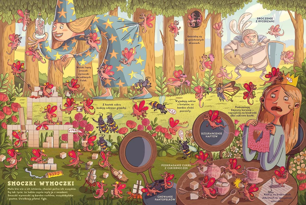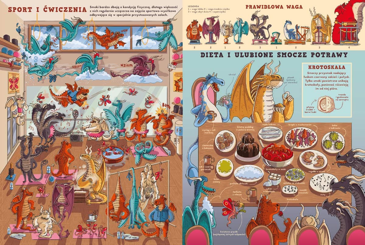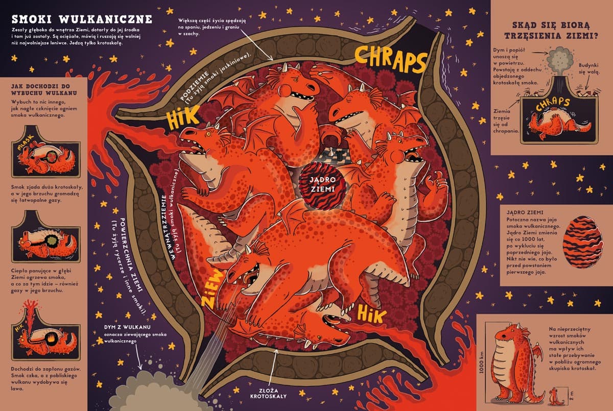 Najwybitniejsze dzieło architektury cukrowej to zamek zbudowany z kostek cukru – fakt czy plotka? Najwięcej złóż krotoskały, smoczego przysmaku, znajduje się blisko jądra Ziemi – fakt czy plotka? Smoki potrafią polizać swój łokieć – fakt czy plotka? Ta niezwykła książka zawiera bardzo dużo faktów i jeszcze więcej plotek o smokach, ich zwyczajach i życiu. Dowiesz się z niej, kto wymyślił liczbę dyrdymalną, z kim smoki grają w bingo i czego uczą się w szkołach. Nikola Kucharska – ilustratorka i autorka książek, komiksów i gier planszowych dla dzieci i młodzieży. Ukończyła projektowanie graficzne na katowickiej ASP. Ma na koncie kilkadziesiąt książek. Współpracuje z wieloma wydawcami w Polsce, Francji, Chinach, Rosji, Korei, Niemczech czy Hiszpanii. Jej „Podróż dookoła świata. Północ–południe. Wschód–zachód” nominowano w konkursie PTWK Najpiękniejsza Książka Roku 2016, a „Zwierzęta, które zniknęły. Atlas zwierząt wymarłych” (teksty: Katarzyna Gładysz, Joanna Wajs i Paweł Łaczek) otrzymały nagrodę główną w konkursie Mądra Książka Roku 2018, wyróżnienie w XVII edycji konkursu Świat Przyjazny Dziecku oraz nominację w konkursie Przecinek i Kropka Najlepsza Książka Roku 2018.Szczegółowe informacje na temat książki Fakty i plotki o smokach