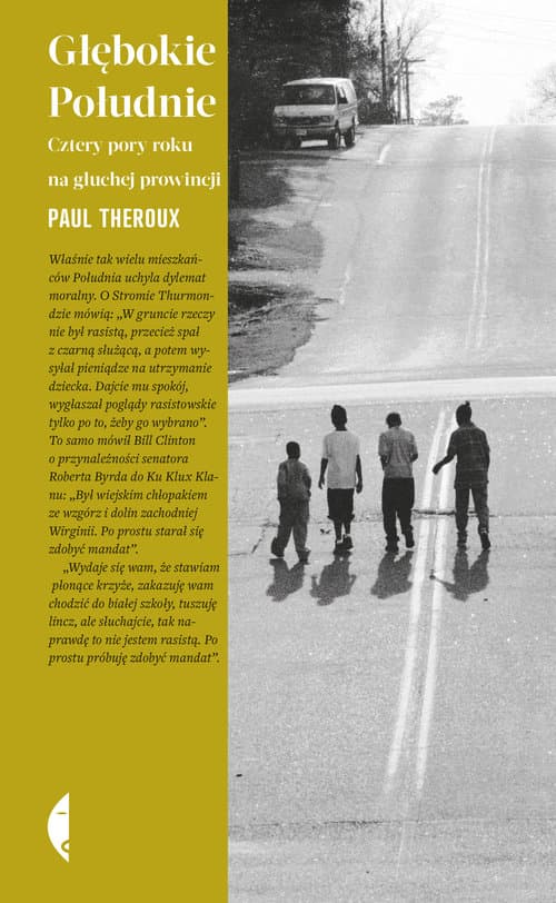 „Głębokie Południe” Paula Theroux to świat, w którym „historia żyje i ma się dobrze” – stosunki między czarnymi a białymi są wciąż napięte, pełne wzajemnych żalów i poczucia krzywdy: wielu zresztą wciąż pamięta czasy segregacji rasowej, a niektórzy twierdzą, że wcale się nie skończyły. Sercem wspólnoty jest tu lokalny kościół, ulubioną niedzielną rozrywką jarmark z bronią, którego uczestnicy zachowują się tak, jakby wojna secesyjna zakończyła się wczoraj. A wokół ciągną się pola bawełny, powoli wypieranej przez inne uprawy. Lecz choć Południe regularnie nawiedzają huragany, choć jest biedne, zacofane i popada w ruinę, równocześnie fascynuje muzyką, kuchnią, pogodą ducha i humorem. Theroux oburza się i pała gniewem, patrząc na nędzę i nierówności, ale podziwia wytrwałość i odwagę działaczy społecznych i zwykłych ludzi doświadczonych przez los. Jego opowieść ma też bohaterów drugoplanowych, znanych i mniej znanych kronikarzy Południa: Williama Faulknera, Mary Ward Brown, Marka Twaina, Carson McCullers, Tennessee Williamsa, którzy tak jak on próbowali zrozumieć i opisać fenomen tego świata. „Theroux mistrzowsko odsłania przed czytelnikiem prawdziwe oblicze amerykańskiego południa i jego mieszkańców. Znakomity dziennik z podróży.” „Kirkus Reviews” „Młode pokolenie autorów książek podróżniczych wiele zawdzięcza Paulowi Theroux. Wciągająca pierwszoosobowa narracja opisuje tu rzeczywistość z bezwzględną szczerością.” „New York Times Book Review” „ W „Głębokim Południu” autor nie zachowuje dystansu, z którym dotąd opisywał świat. Świetlista, wspaniała – jedna z najlepszych książek Theroux od lat.” „Publishers Weekly”