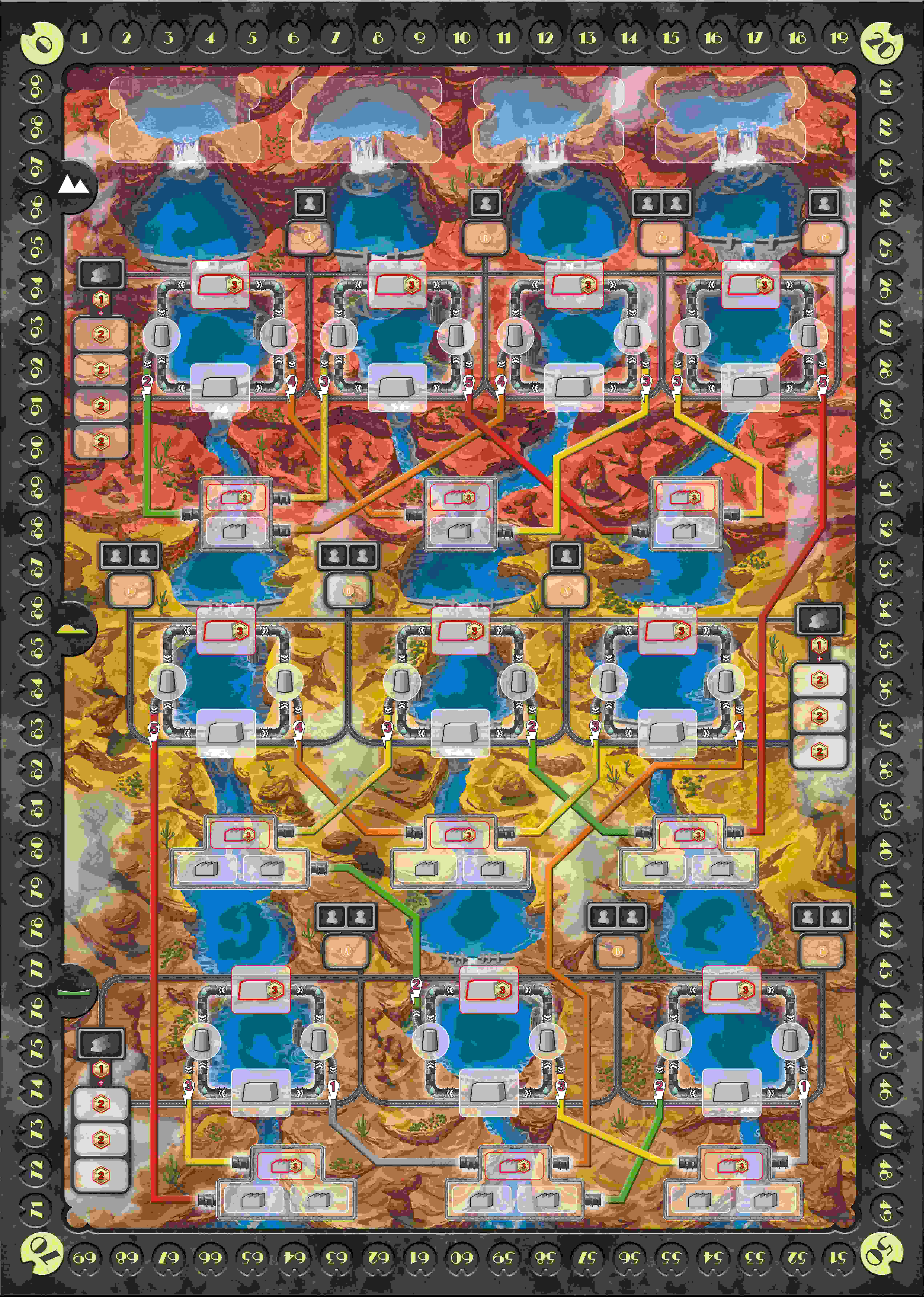 Rzeki przedstawione na Mapie płyną wzdłuż głębokich kanionów, tworząc wyraźne fizyczne oddzielenie wyznaczonych regionów: obecność Mostów zbudowanych na grzbietach Tam umożliwi łatwiejsze połączenie między Osadami Produkcyjnymi w każdym regionie; z drugiej jednak strony Tamy z Mostem na niej do końca gry nie można podnosić.