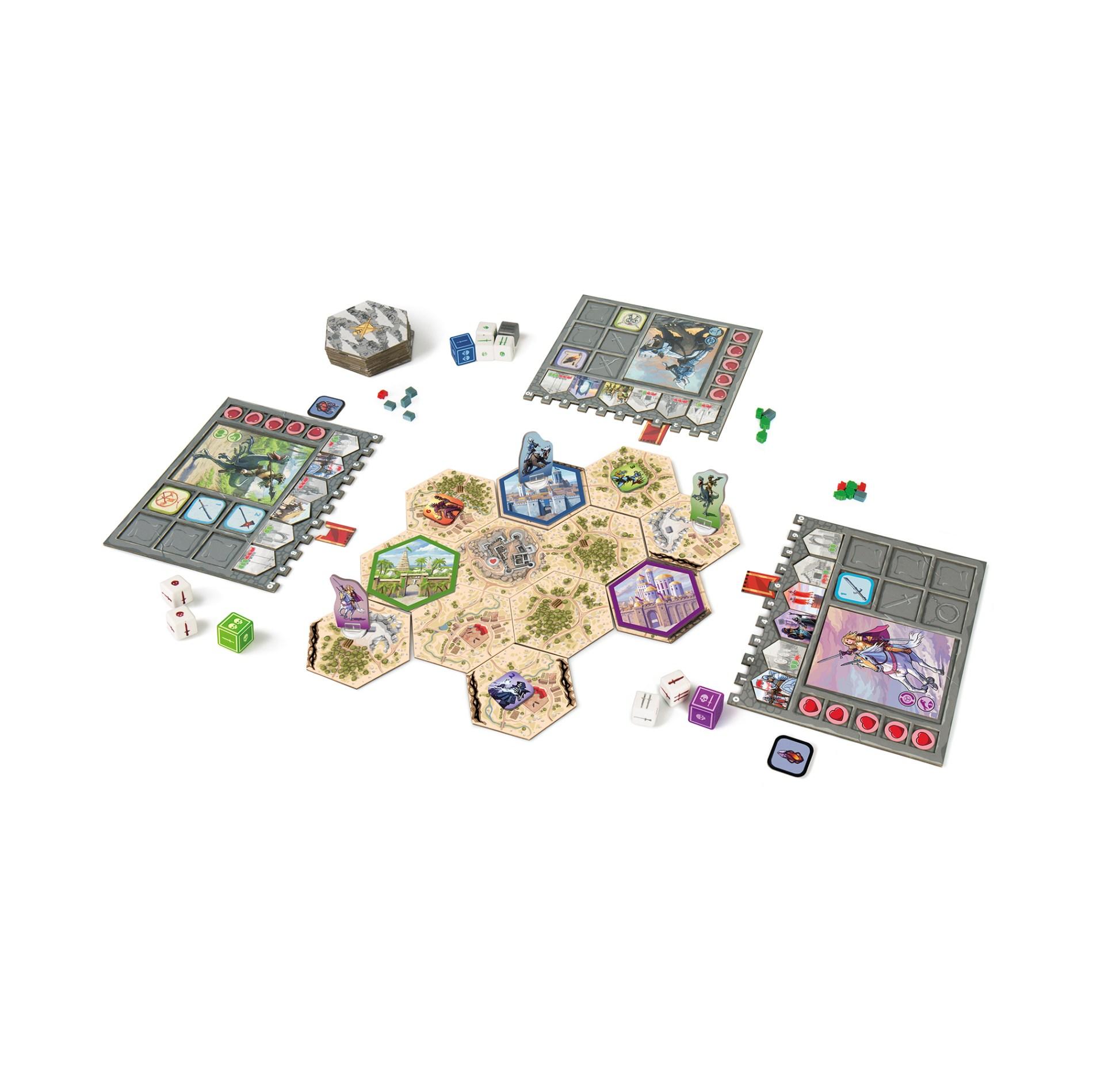 ZAWARTOŚĆ: 26 płytek krajobrazu, 6 tekturowych pionków bohaterów i 6 plastikowych podstawek, 6 kart bohaterów, 6 żetonów miast, 5 arkuszy bohaterów, 5 sztandarów, 6 kości bohaterów, 35 kości oddziałów, 30 żetonów punktów wytrzymałości, 30 żetonów budynków, 40 znaczników żywności, 40 znaczników drewna, 40 znaczników kamienia, 1 materiałowy woreczek, 32 żetony armii potworów, 1 tekturowy pionek Mrocznego Generała ze specjalną podstawką, 5 żetonów gwardzistów, 1 żeton Zarazy, instrukcja