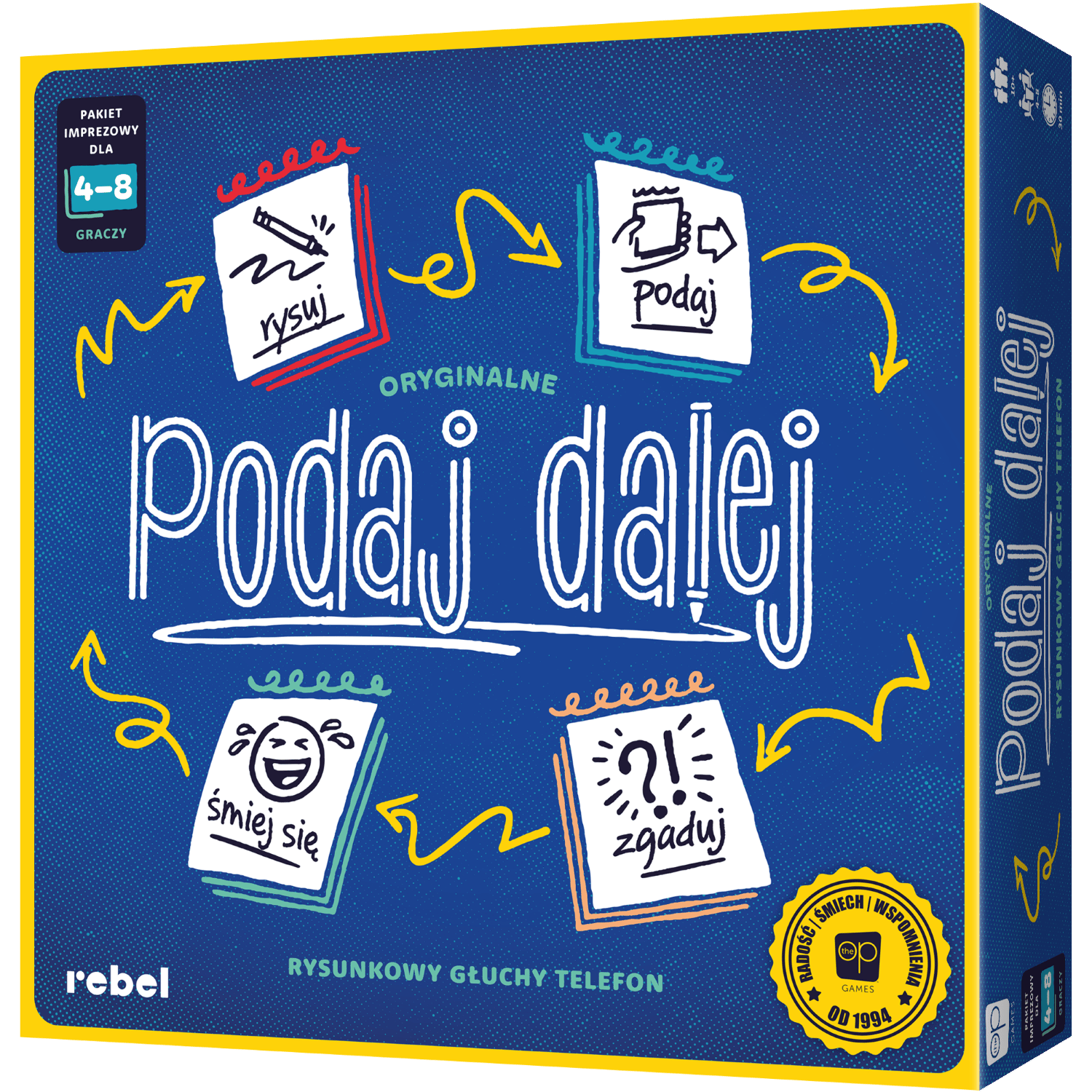 Podaj dalej! to wyjątkowa gra skojarzeniowa dla całej rodziny, perfekcyjnie łącząca kalambury z głuchym telefonem. Podczas zabawy wszyscy jednocześnie rysujemy wylosowane hasła, a następnie staramy się odgadnąć, co narysowali przeciwnicy. Zanim dotrzemy do ostatniej strony szkicownika, czeka nas mnóstwo dziwnych skojarzeń, zabawnych pomyłek i niedopowiedzeń.
