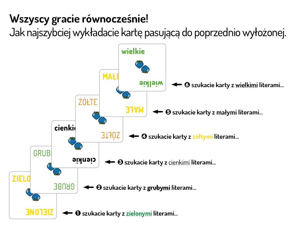 SZALONA GRA IMPREZOWA! Wszyscy gracie równocześnie! Staracie się jak najszybciej wyłożyć na stół wszystkie swoje karty. Aby wygrać, musicie wykazać się spostrzegawczością i szybkością! Gra opiera się na efekcie Johna Ridleya Stroopa, psychologa, który odkrył, że NIE WSZYSTKO JEST TAKIE, JAKIE SIĘ WYDAJE! Wiek: +8 Czas rozgrywki: 20 min Liczba graczy: 2-4