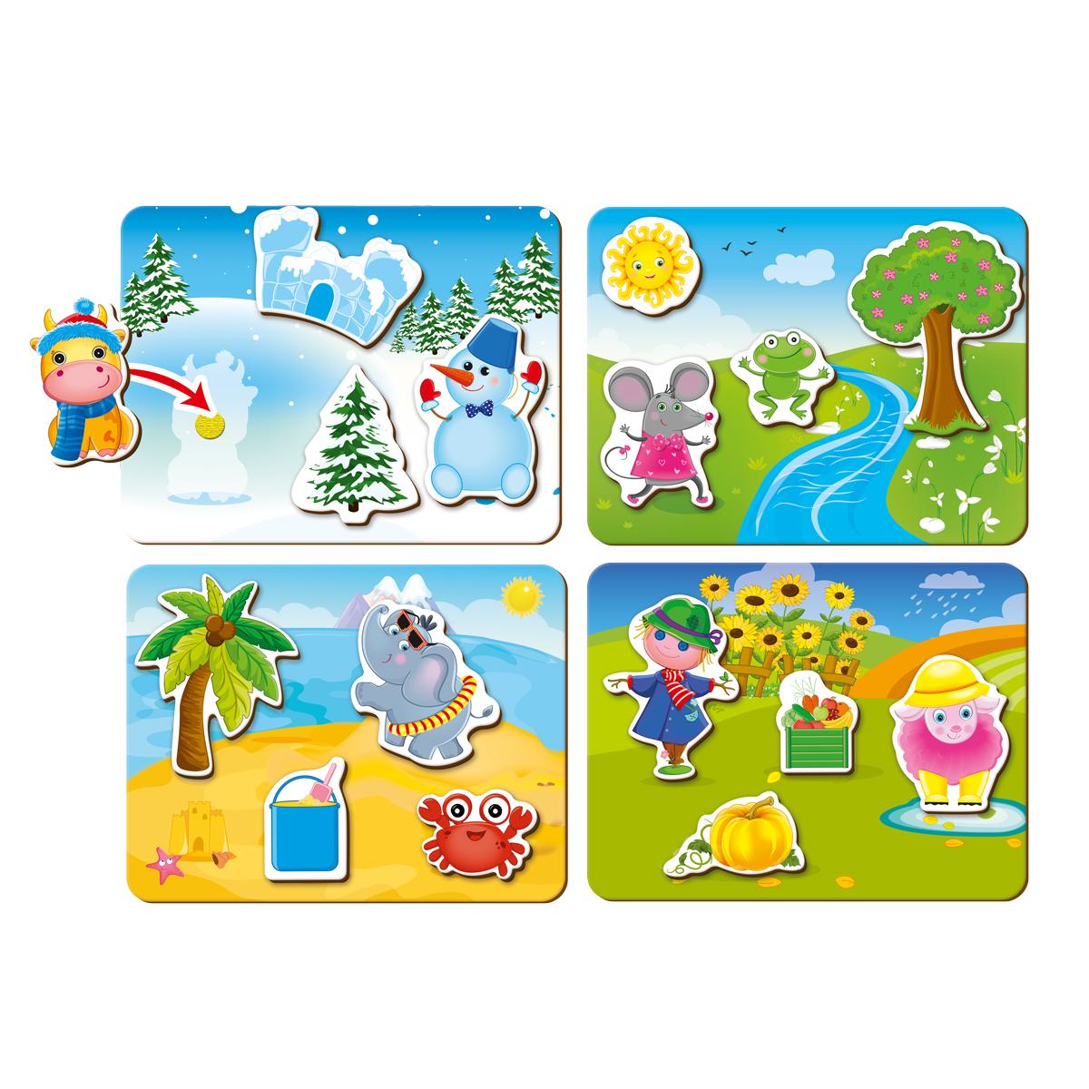 Bałwanek wie wszystko o zimie, radzi ubierać się cieplej i nie zapominać o szaliku! Bocian zaś wraca do rodzinnych stron wiosną, gdy rozkwitają pierwsze przebiśniegi. Przy pomocy rzepek dopasuj je do krajobrazu na planszach, to będą ci wdzięczne!Gra nie tylko będzie pomocna w nauce pór roku, ale będzie także doskonałym ćwiczeniem na logikę i drobną motorykę mięśniową.