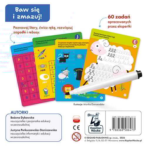 Dzięki różnorodnym zadaniom dzieci poznają literki, uczą się rozpoznawać wśród innych znaków, łączyć je z dźwiękami mowy oraz odczytywać proste wyrazy. To naturalna i angażująca nauka liter, oparta na aktywnym działaniu i dziecięcej ciekawości świata. Zadania to solidny trening ręki i oka. Dziecko rysuje po śladzie, przechodzi labirynty z literami, wyszukuje wyrazy w wykreślankach, dzieli słowa na sylaby i rozwiązuje rebusy obrazkowo-wyrazowe. Tak zaprojektowane ćwiczenia grafomotoryczne rozwijają precyzję ruchów dłoni, koordynację wzrokowo-ruchową oraz przygotowują do nauki pisania.