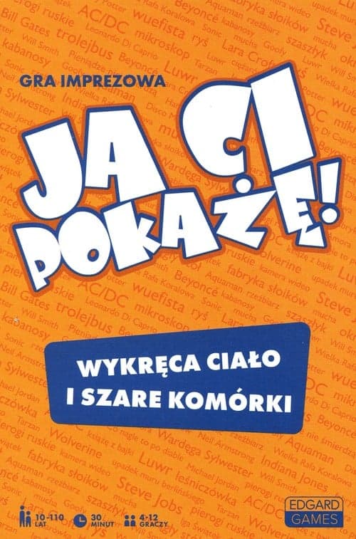 Opisz Dartha Vadera w trzech słowach, pokaż spaghetti samymi dłońmi, zagraj Robin Hooda używając wyłącznie dźwięków i obserwuj reakcje drużyny! Ja ci pokażę to dynamiczna gra towarzyska, która idealnie sprawdzi się podczas imprezy, spotkania z rodziną czy wyjazdu ze znajomymi. Rozgrzejcie szare komórki i zademonstrujcie podchwytliwe hasła na 10 sposobów. Proste zasady, szybkie tempo, zaskakujące hasła i rozgrywki pełne śmiechu gwarantowane. Zaczynamy rozgrywkę wykręcającą ciało i szare komórki! Wystarczy, że podzielicie się na dwie drużyny i wybierzecie poziom trudności. Gracz z jednej drużyny wybiera kartę z wierzchu stosu i odczytuje hasło na odwrocie, rysunek na kolejnej karcie stosu wskazuje sposób demonstrowania hasła. Czas start! Zadaniem gracza jest pokazanie lub opisanie hasła w taki sposób, aby drużyna jak najszybciej odgadła. Ja ci pokażę to: gra imprezowa, która rozrusza imprezę, spotkanie z rodziną czy wyjazd ze znajomymi rozgrywki dla 4-12 osób 440 haseł na 110 kartach 18 kategorii tematycznych 10 sposobów demonstrowania 4 poziomy trudności setki godzin zakręconej zabawy proste zasady, szybkie tempo i zaskakujące hasła
