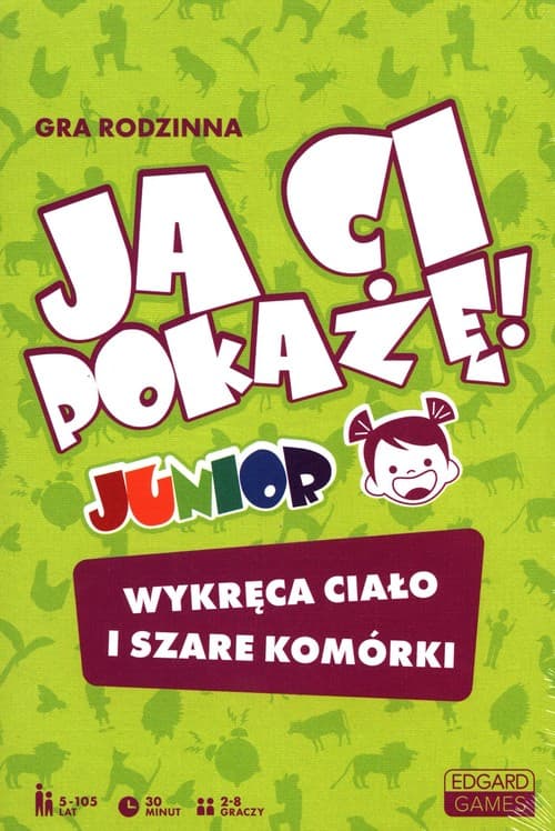 Spróbuj swoich sił w wyjątkowych kalamburach: pokaż baletnicę za pomocą samych dźwięków, opisz smutnym głosem picie wody lub zaprezentuj burzę z piorunami uśmiechając się od ucha do ucha! Ja ci pokażę. Junior to dynamiczna gra dla całej rodziny, która pozwala demonstrować hasła na 6 różnych sposobów i rozgrzewać swoje szare komórki. Szybkie tempo, proste zasady, wiele możliwości i jeszcze więcej śmiechu. Zabierz grę na rodzinny piknik lub spotkanie w gronie przedszkolaków i przekonaj się, że każda rozgrywka to gwarancja wspaniałej zabawy! Jak zagrać? Jeden z graczy wybiera kartę z talii, sprawdza rysunek na odwrocie i prezentuje pozostałym hasło. Ikonka na rewersie karty wskazuje sposób demonstrowania hasła, a zadaniem innych uczestników jest jego odgadnięcie. Możesz wydać dźwięk, pokazać bez słów lub z zamkniętymi oczami. Im więcej haseł odgadniętych w danym czasie, tym większa szansa na zwycięstwo. W grze dostępne są 3 warianty rozgrywek, które można dobierać do wieku i stopnia zaawansowania graczy. Ja ci pokażę to: gra rodzinna idealna do wspólnego spędzania czasu rozgrywki dla 2-8 osób 110 haseł na 110 kartach 3 warianty rozgrywek 6 sposobów demonstrowania setki godzin zakręconej zabawy proste zasady, szybkie tempo i zaskakujące hasła 5-105 lat 30 minut 2-8 graczy