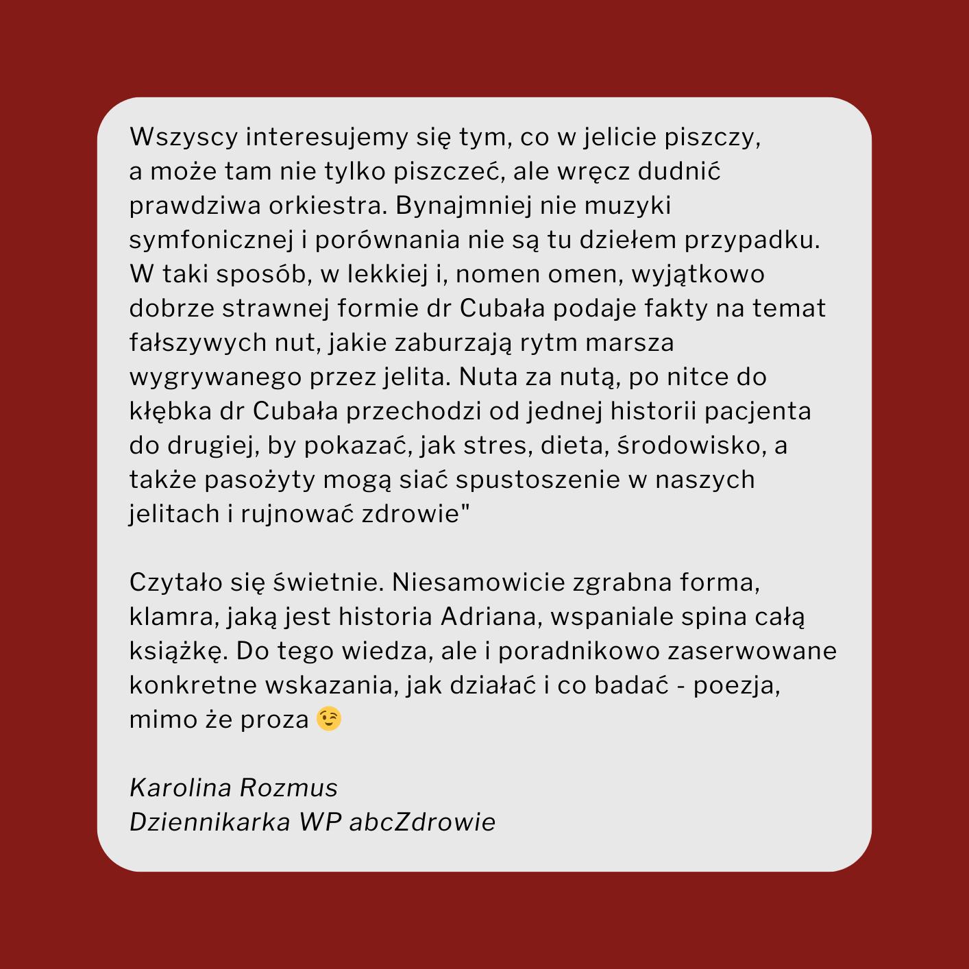 Czy czujesz, że Twoje ciało jest w ciągłej walce? Męczą Cię wzdęcia, bóle brzucha, uczucie ciężkości... A może masz problemy z odpornością, migreny lub zmienne nastroje? Co, jeśli klucz do twojego zdrowia i dobrego samopoczucia tkwi w miejscu, o którym niewiele myślisz – w jelitach? Chcesz jeść ulubione potrawy bez wyrzutów sumienia? Masz dość ciągłego zmęczenia i problemów trawiennych? „Jelitowa Rewolucja” to twoja szansa, by zmienić swoje życie na lepsze. Zadbaj o swoje jelita, a one odwdzięczą się ci zdrowiem, energią i wolnością w jedzeniu tego, co kochasz. Dr Magdalena Cubała-Kucharska, ekspert medycyny integracyjnej, odkrywa prawdę, która może całkowicie odmienić twoje życie. W książce „Jelitowa Rewolucja” dowiesz się, jak zdrowie jelit ma fundamentalne znaczenie dla twojego ciała, energii i dobrego samopoczucia – a nawet długowieczności. Zainspirowana starożytną mądrością Hipokratesa, który twierdził, że "wszystkie choroby zaczynają się w jelitach", dr Cubała-Kucharska prowadzi cię przez fascynujący świat mikrobioty jelitowej – dom dla bilionów mikroorganizmów, które wpływają nie tylko na trawienie, ale także na zdrowie psychiczne, odporność i ogólny stan zdrowia. Ale co, jeśli te mikroorganizmy są w nieładzie? Wtedy pojawia się dysbioza – niewidoczny wróg, który może sabotować każdy aspekt twojego życia. Książka wciąga cię od pierwszej strony, opowiadając historie pacjentów, których codzienne życie było zrujnowane przez problemy jelitowe. Jak Adrian – tancerz, którego życie wywróciły do góry nogami problemy z trawieniem. Jego wystający brzuch i zmęczenie sprawiły, że każdy krok na parkiecie był dla niego wyzwaniem. Ale dzięki odpowiedniej diagnozie i prostym zmianom w diecie, wrócił na szczyt. To tylko jedna z wielu inspirujących historii, które pokazują, że zdrowe jelita mogą całkowicie odmienić życie. To nie jest tylko książka o zdrowiu jelit. „Jelitowa Rewolucja” to praktyczny przewodnik, który czyta się jednym tchem! Krok po kroku pokaże ci, jak rozpoznać sygnały, że twoje jelita potrzebują wsparcia – od wzdęć i bólu brzucha, przez alergie pokarmowe, aż po chroniczne zmęczenie i bóle stawów. Autorka prowadzi cię przez każdy etap – od diagnozy, przez leczenie, aż po odbudowę zdrowej mikrobioty. Odkryjesz, jak ważne jest dbanie o jelita nie tylko poprzez dietę bogatą w błonnik, ale także przez unikanie stresu i dbanie o zdrowy styl życia. Dowiesz się również, jak jelita wpływają na twój mózg, nastrój i odporność. Wiesz, że 90% serotoniny, tzw. hormonu szczęścia, jest produkowane w jelitach? Jeśli chcesz lepiej spać, mieć więcej energii i odzyskać radość życia, musisz zacząć od jelit. W książce znajdziesz także proste i skuteczne wskazówki, które pomogą ci unormować dietę i styl życia. Odkryjesz sześć kluczowych kroków do zdrowych jelit. „Jelitowa Rewolucja” to nie tylko książka dla tych, którzy mają problemy zdrowotne – to lektura dla każdego, kto chce zadbać o zdrowe, silne ciało i cieszyć się długim, pełnym energii życiem. Dzięki tej książce odkryjesz, że zdrowe jelita to klucz do jedzenia tego, co kochasz, bez wyrzutów sumienia, bólu i zmęczenia. Nie czekaj, aż problemy zdrowotne staną się twoją codziennością. Odzyskaj zdrowie, żyj długo i jedz to, co lubisz! Teraz jest twój czas na jelitową rewolucję! Opinie Dr Cubała jest nie tylko wnikliwym, rzetelnym lekarzem i naukowcem. Jest także osobą niezwykle dociekliwą. Fakt ten, okraszony jej nieco amerykańskim poczuciem humoru, sprawia, że książkę tę czyta się, jak dobry kryminał. I jak to w kryminale - najważniejsze jest znaleźć i unieszkodliwić przestępcę. Ale nie sądzicie chyba, że zdradzę zakończenie…? Polecam lekturę. Monika Richardson "Wszyscy interesujemy się tym, co w jelicie piszczy, a może tam nie tylko piszczeć, ale wręcz dudnić prawdziwa orkiestra. Bynajmniej nie muzyki symfonicznej i porównania nie są tu dziełem przypadku. W taki sposób, w lekkiej i, nomen omen, wyjątkowo dobrze strawnej formie dr Cubała podaje fakty na temat fałszywych nut, jakie zaburzają rytm marsza wygrywanego przez jelita. Nuta za nutą, po nitce do kłębka dr Cubała przechodzi od jednej historii pacjenta do drugiej, by pokazać, jak stres, dieta, środowisko, a także pasożyty mogą siać spustoszenie w naszych jelitach i rujnować zdrowie" Czytało się świetnie. Niesamowicie zgrabna forma, klamra, jaką jest historia Adriana, wspaniale spina całą książkę. Do tego wiedza, ale i poradnikowo zaserwowane konkretne wskazania, jak działać i co badać - poezja, mimo że proza. Karolina Rozmus Dziennikarka WP abcZdrowie dr.n.med Magdalena Cubała-Kucharska Dr Magdalena Cubała-Kucharska to lekarz z powołania, który od lat zmienia życie swoich pacjentów, podchodząc do nich z pełnym zaangażowaniem i pasją. Absolwentka Uniwersytetu Medycznego w Łodzi, jest także członkiem zarządu prestiżowego Stowarzyszenia ILADEF USA. Jej wiedza i doświadczenie sięgają daleko poza standardowe granice medycyny rodzinnej – to prawdziwa pionierka, która łączy nowoczesne procedury medyczne z tradycyjnymi metodami leczenia, potwierdzonymi badaniami naukowymi. Nieustannie rozwija swoje umiejętności, uczestnicząc w międzynarodowych konferencjach medycznych w Polsce, Europie i USA. Jako wykładowczyni i współorganizatorka, dzieli się swoją wiedzą z lekarzami i naukowcami z całego świata. Jej głównym celem jest spojrzenie na pacjenta jako na całość – nie jako na zbiór organów, ale jako na złożoną strukturę, w której każda dysfunkcja jest częścią większej układanki. To dzięki tej filozofii udaje się jej łączyć elementy, które inni mogliby pominąć, tworząc z nich precyzyjne i skuteczne plany leczenia, poprawiające jakość życia nie tylko