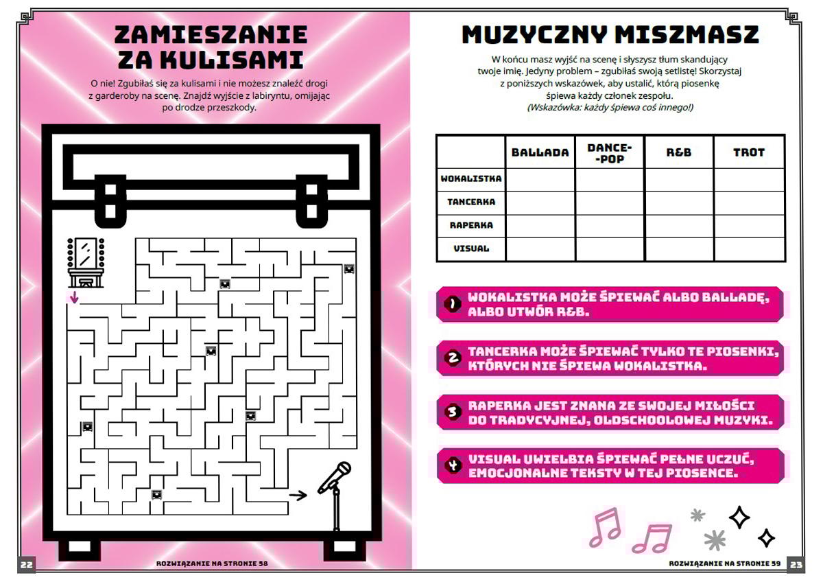W środku czeka mnóstwo angażujących zadań: projektowanie i dekorowanie własnego mikrofonu, tworzenie scenicznych stylizacji dla członków boysbandu, wybieranie ról takich jak lider, wokalista czy tancerz, a także rysowanie i budowanie własnego wizerunku artystycznego. Mały, poręczny format sprawia, że można ją zabrać wszędzie – do torby czy plecaka, aby kreatywność była zawsze pod ręką. Książka oferuje również pomysłowe łamigłówki i muzyczne zagadki, które wciągają i rozwijają wyobraźnię, a specjalny generator nazw pozwala stworzyć unikalną nazwę zespołu niczym prawdziwa grupa K-Pop. Dodatkową atrakcją są zadania inspirowane kulturą koreańską, takie jak komponowanie idealnej miski ramen czy przygotowanie posta zapowiadającego wielki comeback k-popowego zespołu i premierę nowego albumu.
