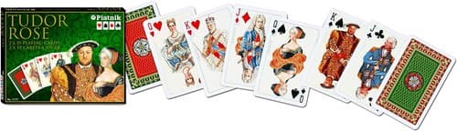 Najwyższej jakości karty do gry Piatnika. Na awersach angielska dynastia Tudorów, a na rewersach herb ''Róża Tudorów''.