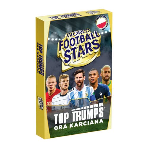 TOP TRUMPS World Football Stars Kolekcjonerska gra karciana TOP TRUMPS już teraz w edycji World Football Stars! Na kartach znajdziesz sławnych piłkarzy, takich jak Christiano Ronaldo, Lionel Messi, czy Neymar wraz z ciekawostką oraz punktacją w kategoriach: mecze, bramki, trofea, rok urodzenia oraz ranking Top Trumps. Podczas karcianej rozgrywki przypominającej wojnę, wygrywają karty z największymi wartościami w wybranej kategorii. Kompaktowa gra w poręcznym opakowaniu nie tylko pozwoli na szybką rozgrywkę, ale i poszerzy wiedzę na temat światowych gwiazd piłki nożnej. Jak grać? Potasuj talię i rozdaj karty wszystkim graczom. Upewnij się, że żaden z uczestników rozgrywki nie podgląda utworzonych stosów. Rozpoczynający gracz odkrywa pierwszą kartę i wybiera jeden z atrybutów swojego bohatera. Pozostali gracze również sięgają po pierwszą kartę ze swoich stosów i porównują wartości wybranego atrybutu. Gracz z najwyższą ilością punktów zabiera karty przeciwników i umieszcza je na spodzie swojego stosu. Zwycięża uczestnik rozgrywki, który przejmie wszystkie karty. Zawartość gry: 33 karty w praktycznym papierowym pudełku. Specyfikacja: Ilość graczy: 2+, Wiek: 6+, Czas gry: 15 minut, Język wydania: polski. Uwaga! Produkt nieodpowiedni dla dzieci poniżej 3 roku życia.