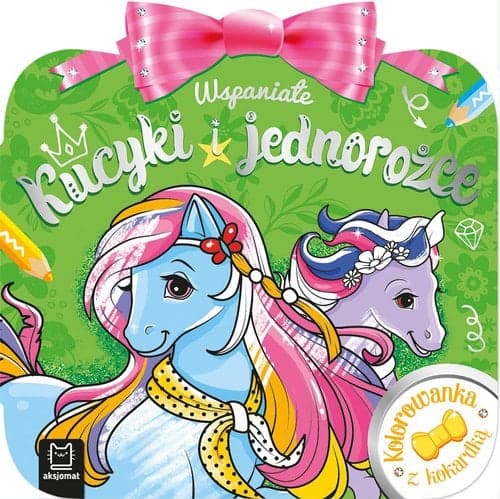 Kolorowanka z kokardką. Wspaniałe kucyki i jednorożce Kolorowanki o lubianej przez dzieci tematyce z niezwykle starannymi ilustracjami z pewnością przypadną do gustu małym odbiorcom. Dodatkową zaletą książeczki jest nietypowy format z kokardką. Kolorowanie uspokaja, wycisza, rozwija wyobraźnię i zdolności manualne. Zapraszamy do wspólnej zabawy w kolorowanie!