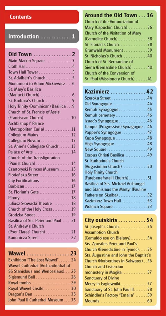 Kieszonkowy przewodnik, opisujący główne zabytki Krakowa, niektóre ulice i dzielnice oraz ich historię, podzielony jest na pięć rozdziałów: Stare Miasto, Wawel, Wokół Starego Miasta, Kazimierz