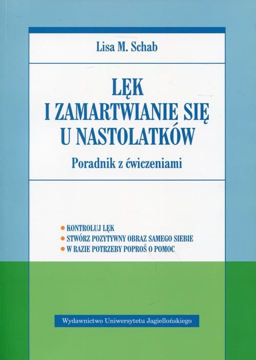 Ćwiczenia, które pomogą w przezwyciężeniu lęku i zamartwiania się. Mniej więcej jeden na trzech nastolatków zmaga się z uczuciem niepokoju, strachu i napadami paniki. Kołatanie serca, pocenie się, drżenie ciała, bóle brzucha to tylko niektóre z objawów towarzyszące tym stanom. W okresie dojrzewania są one najbardziej powszechne, ponieważ w sferze fizycznej, emocjonalnej i psychicznej dochodzi wówczas do wielu zmian. Jeśli nastolatkowie nie znajdą sposobu na poradzenie sobie z lękiem, wraz z wiekiem ten stan może się pogorszyć i przejąć kontrolę nad ich życiem. Praktyczny podręcznik radzenia sobie z lękiem dla nastolatków pokazuje, jak opanować uczucie lęku i położyć kres zamartwianiu się. Pomaga wypracować pozytywny obraz samego siebie i rozpoznać niespokojne myśli. Zawiera opis technik, które nastolatkowie mogą stosować samodzielnie lub z pomocą psychologa. Podręcznik oferuje również wskazówki, jak szukać dodatkowego wsparcia, jeśli okaże się to konieczne. „Odczuwanie lęku to częsty i uleczalny stan. Wykonując zawarte w tej książce ćwiczenia, dowiesz się, jak zapobiegać lękowi i jak sobie z nim radzić. Niektóre z ćwiczeń początkowo mogą się wydawać nietypowe. Być może będą one wymagały zrobienia czegoś, co jest dla ciebie całkowitą nowością. Nawet jeśli zawarte tutaj sugestie odbiegają od twoich przyzwyczajeń, zachęcam do tego, aby je wypróbować. Czasami najdziwniejsze ćwiczenie może się okazać tym najbardziej pomocnym.” Lisa M. Schab LISA M. SCHAB jest pracownikiem socjalnym prowadzącym prywatną praktykę na przedmieściach Chicago. Pisze artykuły do miesięcznika dla rodziców „Chicago Parent” i jest autorką ośmiu poradników dla dzieci i dorosłych. Prowadzi warsztaty terapii opartej na technikach relaksacyjnych i samopomocy dla szerokich kręgów społeczeństwa oraz szkolenia zawodowe dla terapeutów.