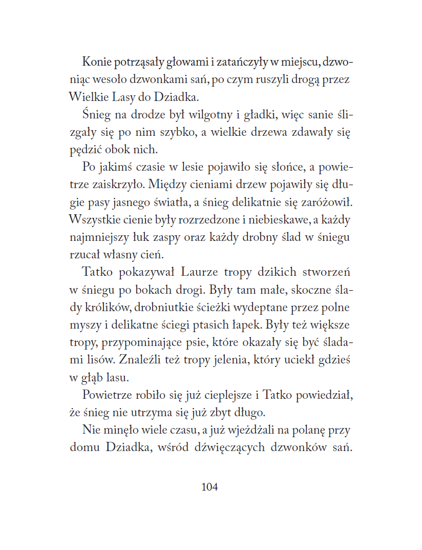 Klasyka literatury dziecięcej w nowym tłumaczeniu. Kultowa seria, kochana przez czytelników i widzów na całym świecie, czeka na kolejne pokolenie! W samym sercu lasów Wisconsin stoi mały domek. Mieszkają w nim Tatko, Mamusia i trzy dziewczynki. Z okien widać tylko drzewa, a do najbliższego miasteczka jest bardzo daleko. Goście pojawiają się tutaj rzadko. Dzika przyroda każdego dnia jest tu na wyciągnięcie ręki, a spotkanie z niedźwiedziem mrozi krew w żyłach. Każda pora roku przynosi coś nowego: zima – fantazyjne wzory szronu na szybach, wiosna – bieganie na bosaka, lato – miód z leśnej barci, jesień – grę na skrzypcach przy wesoło trzaskającym kominku. Oczami rezolutnej Laury obserwujemy otaczający ją świat i spokojny rytm rodzinnego życia połączony z dziecięcą beztroską i figlami. Pełna ciepła, spokoju i uroku historia, przypomina, że czasem wystarczy mały domek w wielkich lasach, by odnaleźć to, co naprawdę ważne. Stanowi świetny wstęp do czekających na nas kolejnych przygód dorastających sióstr.Szczegółowe informacje na temat książki Mały domek w Wielkich Lasach