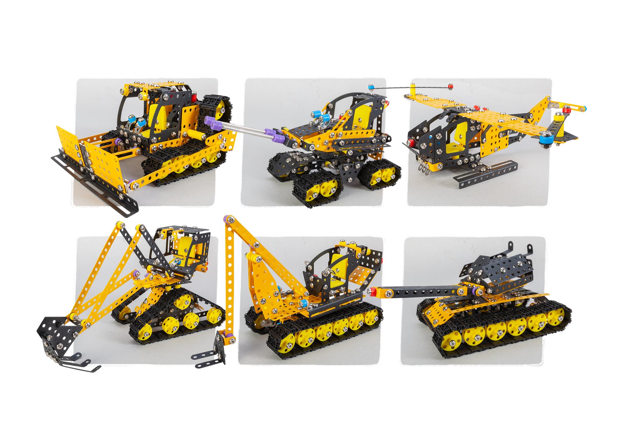 Każdy model składa się z elementów metalowych o różnej wielkości i kształtach, a także jest wzbogacony kolorowymi elementami z tworzyw sztucznych.