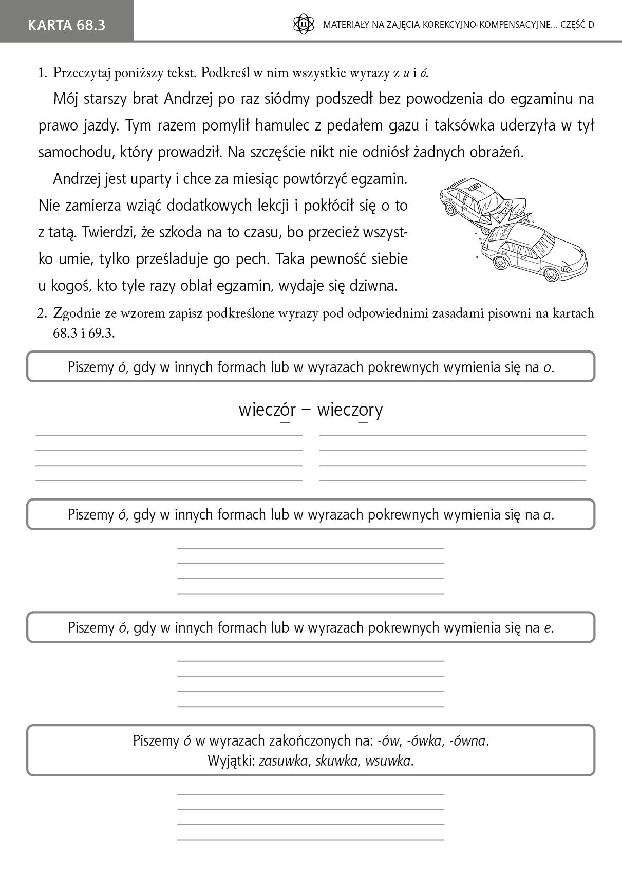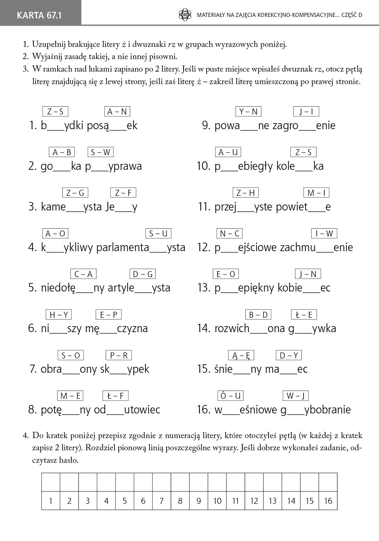 Prezentowane karty pracy mają służyć doskonaleniu umiejętności czytania i pisania przez uczniów zarówno podczas zajęć korekcyjno-kompensacyjnych, jak i w trakcie regularnych zajęć lekcyjnych. Zawierają liczne zadania językowe, w tym ortograficzne i gramatyczne.