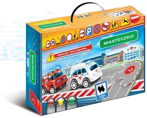 Gra dla 2 do 4 graczy w wieku od lat 4 do 104. Miasteczko jest grą składającą się z puzzli „uliczek”, po których gracze poruszają się samochodami służb miejskich zgodnie z przepisami ruchu drogowego. Przed grą kierowcy łączą elementy puzzli i tworzą uliczki. Do gry dołączone są makiety budynków, które wizualizują miejsce akcji. Rolę kostki pełni prędkościomierz z sygnalizatorem . Na niektórych polach umiejscowione są pola ze znakiem "?" lub "!" , które zobowiązują gracza do wylosowania karty z odpowiedniej talii i wykonania zadania. Na kartach znajdują się podstawowe znaki drogowe oraz ich objaśnienia . Każde wykona-nie zadania z Kart Znaków Drogowych oraz Kart Przygód Drogowych wzbogaca początkującego kierowcę o doświadcze-nie i pozwala pozbyć się kartonika z "Zielonym Listkiem". Wygrywa ten , kto pozbędzie się wszystkich kartoników z "Zielonym Listkiem" i pierwszy dotrze na metę, czyli sprawnie i zgodnie z przepisami ruchu drogowego przejedzie uliczkami Miasteczka .