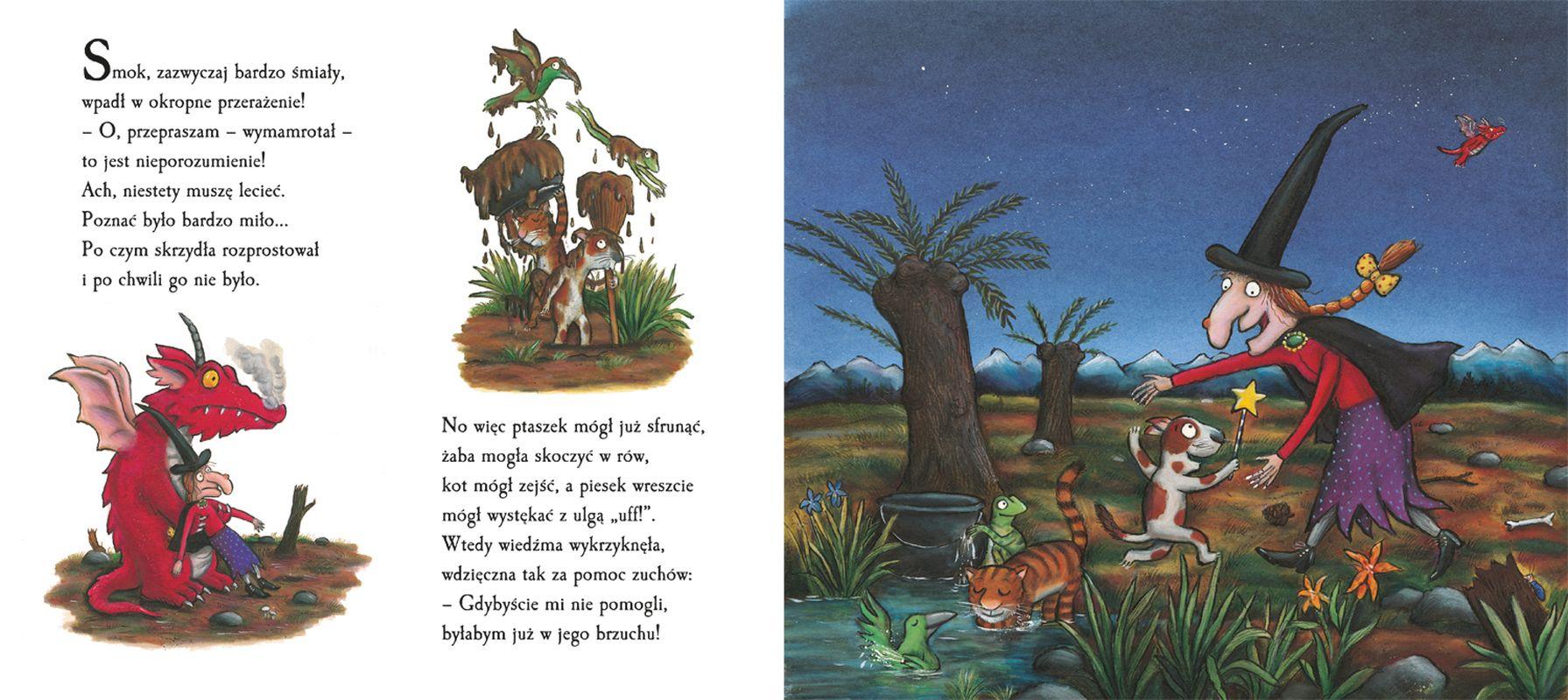 Do czarownicy, która leci na miotle razem ze swoim kotem, dosiadają się pies, ptaszek i żaba. Pod wpływem ciężaru miotła pęka, a bohaterowie spadają wprost na wygłodniałego smoka. Czy zdołają go przechytrzyć?Szczegółowe informacje na temat książki Miejsce na miotle