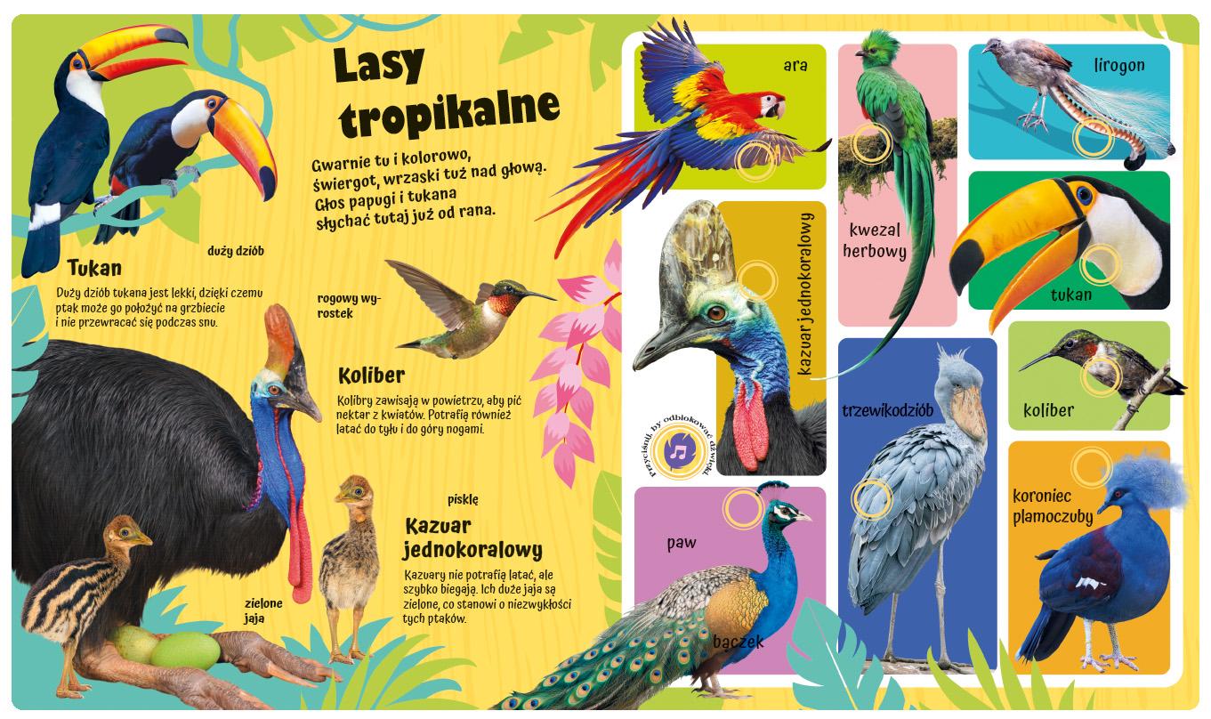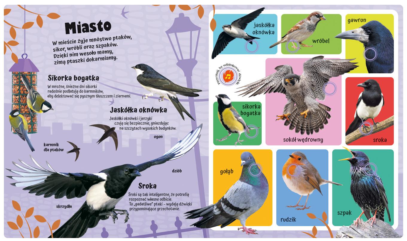 Książka zabiera małych czytelników w niezapomnianą PODRÓŻ DO ŚWIATA PTAKÓW. Dzieci znajdą w niej proste WIERSZYKI o ptakach zamieszkujących różne środowiska, a także krótkie CIEKAWOSTKI. Wyróżnikiem publikacji jest aż 60 różnorodnych DŹWIĘKÓW. Dzięki niej maluch dowie się, jakie dźwięki wydają sikorka, głuszec, jemiołuszka czy kukabura. Starannie dobrane ZDJĘCIA charakteryzują się ŻYWĄ KOLORYSTYKĄ.