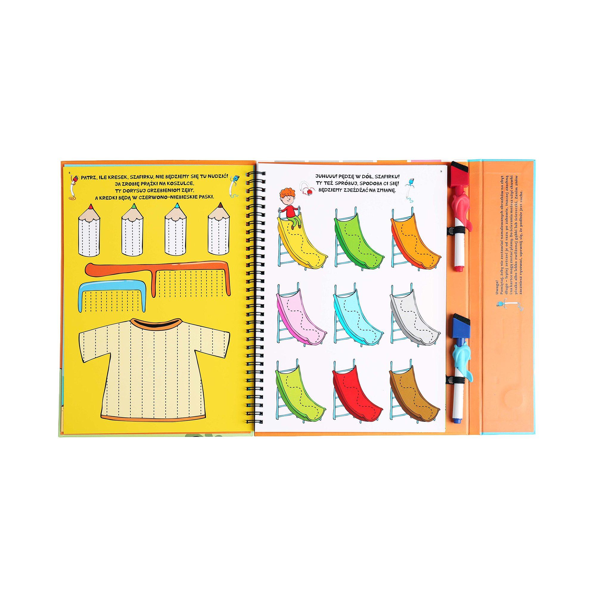 W zestawie: 50 stron z zadaniami (spiętych spiralą), 2 pisaki zmazywalne z gąbką nakładkami do prawidłowego chwytu.