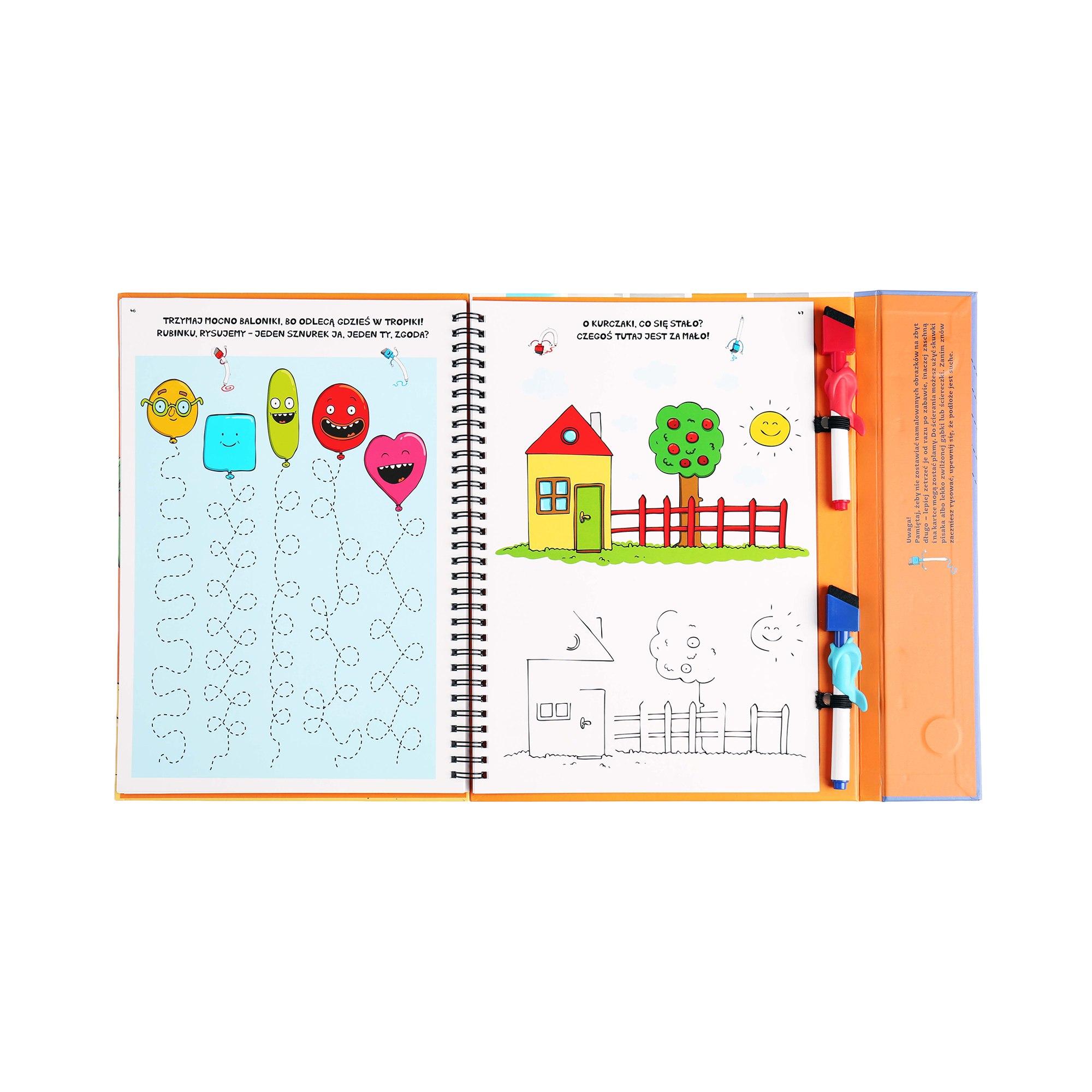 W zestawie: 50 stron z zadaniami (spiętych spiralą), 2 pisaki zmazywalne z gąbką nakładkami do prawidłowego chwytu.