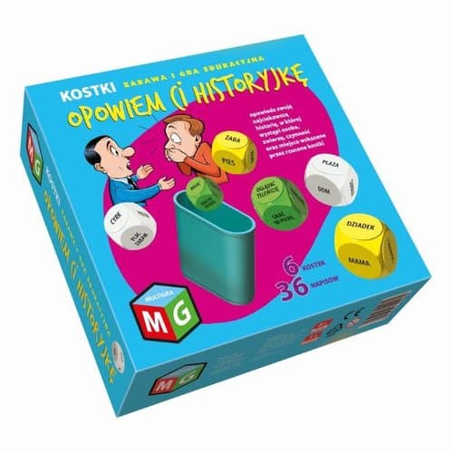 Kostki z wyrazami OPOWIEM CI HISTORYJKĘ to prosta ale bardzo ciekawa wymagająca kreatywnego myślenia zabawa i gra edukacyjna. Na 6 kostkach znajdują się wyrazy określające osobę, zwierzę, czynność i miejsce. Zabawa polega na tym, by po rzucie kostkami opowiedzieć historyjkę, która będzie zawierała wszystkie elementy wskazane przez kostki. Gra z użyciem kostek skierowana jest dla tych, którzy lubią wymyślać historię, ale i szybko pisać. Gra od zabawy różni się tym, że po rzucie kostkami gracze starają się jak najszybciej napisać swoją historyjkę z użyciem wyrazów znajdujących się na kostkach. OPOWIEM CI HISTORYJKĘ- kostki to świetna pomoc dydaktyczna, rozwija wyobraźnię, zmusza do myślenia i uczy poprawnego wysławiania się i pisowni. Zawartość pudełka: 6 kostek z obrazkami, kubek, instrukcja. Wiek graczy: 8+ Liczba graczy: 1+