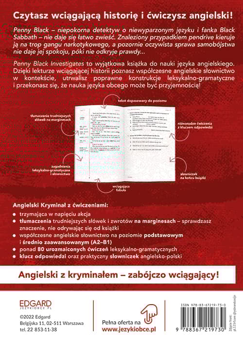 Penny Black Investigates to wyjątkowa książka do nauki języka angielskiego. Dzięki lekturze wciągających historii kryminalnych poznasz współczesne angielskie słownictwo, utrwalisz gramatykę i przekonasz się, że nauka języka obcego może być przyjemnością, której nie sposób się oprzeć! W każdym rozdziale umieszczono ćwiczenia utrwalające poznane słownictwo i konstrukcje gramatyczno-leksykalne, a także sprawdzające rozumienie treści.