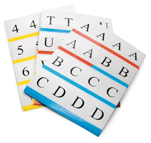 Zestaw kartoników z cyframi i literami drukowanymi – wielkimi i małymi – do układania sylab, wyrazów i zdań z kolorystycznym oznaczeniem samogłosek i spółgłosek.
