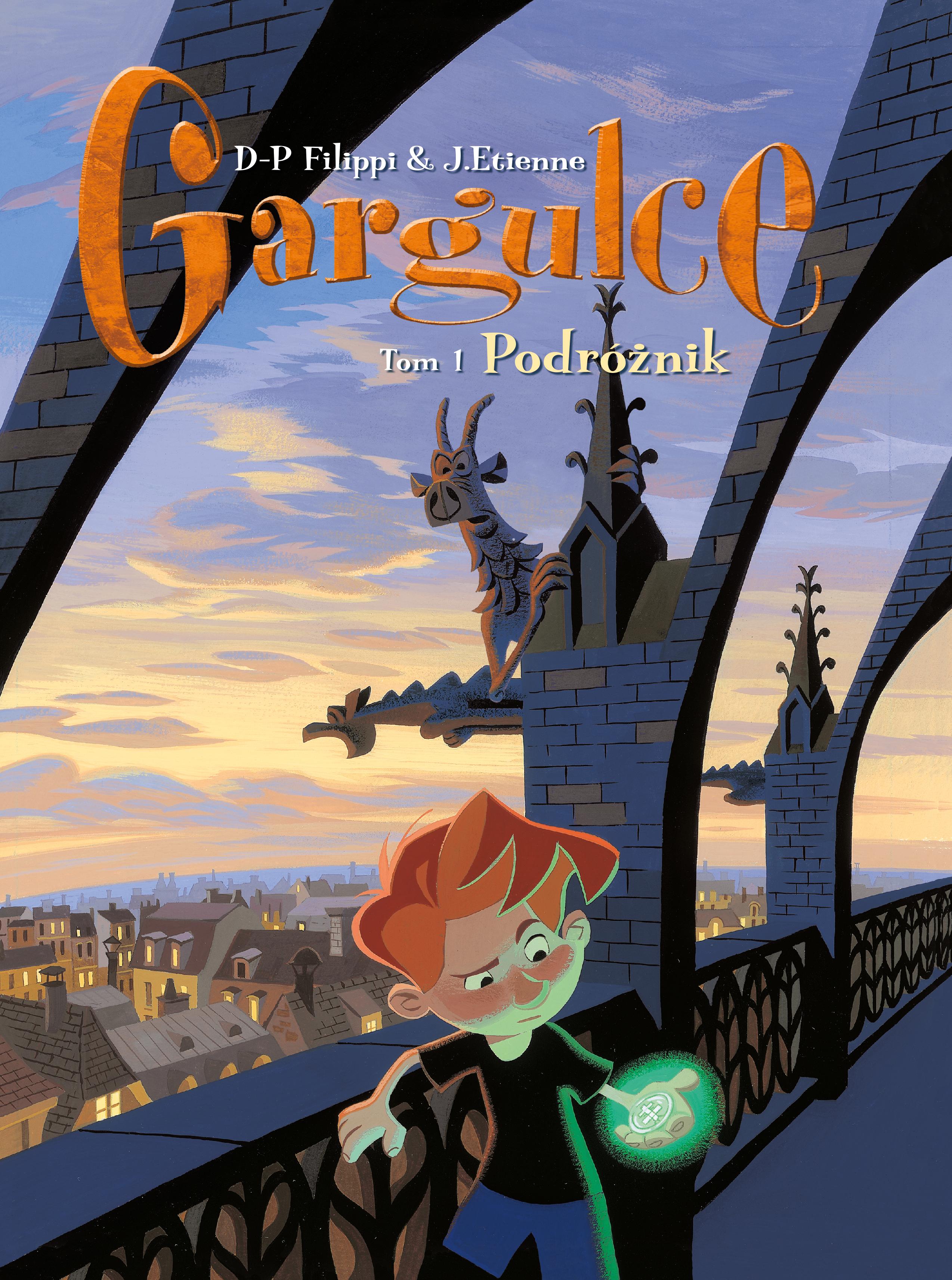 Pierwszy tom przygodowo-fantastycznej opowieści dla młodych czytelników. Grzesiek wraz z rodzicami i starszą siostrą przeprowadza się do miasta, którego głównymi atrakcjami są gotycka kolegiata i ponura cytadela. Kiedy chłopiec znajduje dziwny medalion, rozpoczyna się niewiarygodna przygoda, podczas której pozna magiczne tajemnice, a przy okazji wplącze się w odwieczną rozgrywkę między siłami dobra i zła. Na szczęście nasz bohater jest dzielny i pomysłowy, więc chyba da sobie radę! Głównymi autorami serii są często działający w tandemie dwaj twórcy, francuski scenarzysta Denis-Pierre Filippi i włoski rysownik Silvio Camboni, doskonale znani polskiemu czytelnikowi ze wspólnych dzieł: cyklu „Niezwykła podróż” oraz albumów „Miki i zaginiony ocean” oraz „Miki i kraina Pradawnych”. Camboni ilustruje „Gargulce” od drugiego tomu, natomiast tom pierwszy narysował francuski grafik o pseudonimie J. Étienne (właśc. Étienne Jung; m.in. „Chimery Wenus”, „Auguste et Romulus”, „Brüssli”).