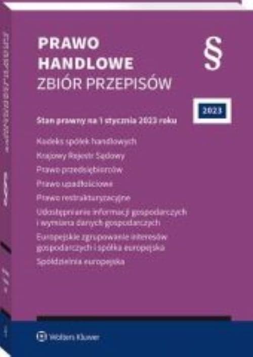 Stan prawny: 1 stycznia 2023 r. Zbiór uwzględnia zmiany, które zostały opublikowane do dnia 1 stycznia 2023 r., w tym m.in.: Kodeks spółek handlowych: ➢ ustawa z 7 lipca 2022 r. o finansowaniu społecznościowym dla przedsięwzięć gospodarczych i pomocy kredytobiorcom (Dz.U. poz. 1488) ➢ ustawa z 15 września 2022 r. o medycynie laboratoryjnej (Dz.U. poz. 2280) ➢ ustawa z 4 listopada 2022 r. o zmianie ustawy o Krajowym Rejestrze Sądowym, ustawy Kodeks postępowania cywilnego oraz ustawy Kodeks spółek handlowych (Dz.U. poz. 2436) Krajowy Rejestr Sądowy: ➢ ustawa z 9 lutego 2022 r. o zmianie ustawy Kodeks spółek handlowych oraz niektórych innych ustaw (Dz.U. poz. 807) ➢ ustawa z 4 listopada 2022 r. o zmianie ustawy o Krajowym Rejestrze Sądowym, ustawy Kodeks postępowania cywilnego oraz ustawy Kodeks spółek handlowych (Dz.U. poz. 2436) Prawo upadłościowe: ➢ ustawa z 9 lutego 2022 r. o zmianie ustawy Kodeks spółek handlowych oraz niektórych innych ustaw (Dz.U. poz. 807) ➢ Udostępnianie informacji gospodarczych i wymiana danych gospodarczych: ➢ ustawa z 5 sierpnia 2022 r. o zmianie ustawy - Kodeks karny wykonawczy oraz niektórych innych ustaw (Dz.U. poz. 1855)