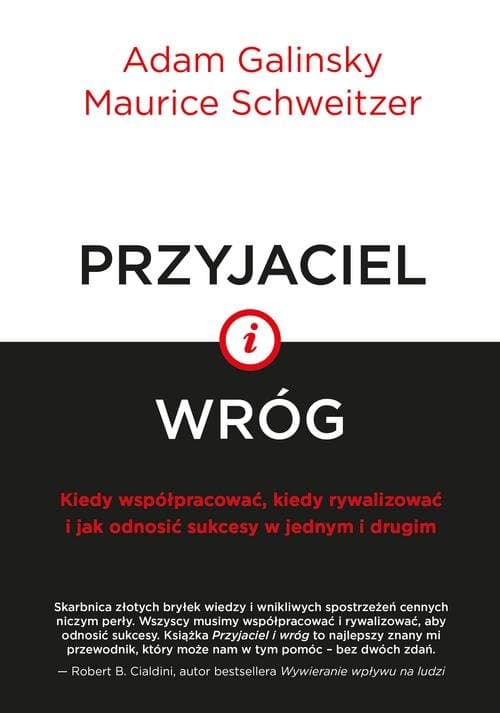 Skarbnica złotych bryłek wiedzy i wnikliwych spostrzeżeń cennych niczym perły. Wszyscy musimy współpracować i rywalizować, aby odnosić sukcesy. Książka Przyjaciel i wróg to najlepszy znany mi przewodnik, który może nam w tym pomóc – bez dwóch zdań. – Robert B. Cialdini, autor bestsellera Wywieranie wpływu na ludzi Co jest potrzebne do odniesienia sukcesu? To pytanie jest przedmiotem toczącego się od dawna sporu. Niektórzy twierdzą, że ludzie są z natury skłonni do rywalizacji, a dbałość o własny interes jest najlepszym sposobem, w jaki można wyprzedzić konkurentów. Inni uważają, że ludzie są stworzeni do współpracy i że odnoszą największe sukcesy, kiedy współdziałają z bliźnimi. W książce Przyjaciel i wróg Adam Galinsky i Maurice Schweitzer wyjaśniają, dlaczego ten spór nie trafia w sedno sprawy. My, ludzie, nie mamy wrodzonej skłonności do rywalizacji albo do współpracy; ewolucja przygotowała nas do obu tych zachowań. W każdej relacji – od współpracowników, przez przyjaciół i współmałżonków, po rodzeństwo – jesteśmy równocześnie przyjaciółmi i wrogami. Tylko poprzez nauczenie się, jak osiągnąć i utrzymać równowagę między tymi dwiema siłami, możemy udoskonalić swoje długotrwałe związki i z większym powodzeniem zdobywać to, czego chcemy. Galinsky i Schweitzer opierają się na oryginalnych, nowatorskich badaniach, jakie przeprowadzili w swoich laboratoriach, a także na odkryciach dokonanych na gruncie nauk społecznych i na obrazowych przykładach z życia, aby pokazać, jak można odnosić większe sukcesy w pracy i w życiu prywatnym poprzez zręczne radzenie sobie z napięciem między współpracą a rywalizacją. Oferują cenne spostrzeżenia i wskazówki dotyczące rozmaitych tematów – od tego, jak zdobyć i utrzymać władzę, jak zbudować zaufanie i jak je odzyskać, oraz jak łagodzić konflikty i przeciwdziałać uprzedzeniom w miejscu pracy, po to, jak porównywać się z innymi, aby zwiększyć swoją motywację i zapewnić sobie poczucie szczęścia, oraz jak odnosić sukcesy w negocjacjach – osiągać własne cele, a jednocześnie dbać o zadowolenie partnerów przy stole negocjacyjnym. Przy okazji autorzy stawiają kilka intrygujących pytań i udzielają na nie zaskakujących odpowiedzi: kiedy nadmiar talentu może przeszkadzać w odniesieniu sukcesu? Dlaczego mniej kompetentne działanie może Ci zapewnić wysoki status i autorytet? Skąd tak naprawdę bierze się duża część różnic między płciami w miejscu pracy? Wreszcie, dlaczego lepiej występować na końcu w programie telewizyjnym Idol i podczas rozmów kwalifikacyjnych, ale warto być pierwszym, który składa ofertę w trakcie negocjowania zakupu nowego samochodu? Adam Galinsky jest profesorem zarządzania i dziekanem Wydziału Zarządzania w Columbia Business School na Uniwersytecie Columbia. Maurice Schweitzer jest profesorem Wharton School na Uniwersytecie Stanu Pensylwania. Galinsky i Schweitzer opublikowali łącznie ponad 250 artykułów naukowych i rozdziałów w książkach z dziedziny zarządzania, psychologii i ekonomii. Jedna z najlepszych książek popularno-naukowych z dziedziny nauk społecznych, jakie przeczytałem od długiego czasu. Pełna wnikliwych spostrzeżeń i trafnych wniosków. Aż się zmęczyłem robieniem notatek! – Daniel H. Pink, autor bestsellerów „New York Timesa”, Drive i Jak być dobrym sprzedawcą Dwaj poważani badacze sukcesu wyjaśniają, jak żyć z innymi w zgodzie i jak uzyskać przewagę. Pouczająca, zabawna i nadzwyczaj praktyczna! – Angela Duckworth, Uniwersytet Stanu Pensylwania, autorka książki Grit Fascynująca podróż po naukowej wiedzy o współpracy i rywalizacji. Odkryj, dlaczego porównujemy się ze znajomymi z Facebooka, dlaczego wiele różnic między płciami tak naprawdę wynika z różnic pod względem władzy oraz dlaczego w większości wypadków warto złożyć pierwszą ofertę w trakcie negocjacji. – Adam Grant, autor bestsellera „New York Timesa”, Give and Take Dzięki tej książce staniesz się lepszym współpracownikiem, lepszym negocjatorem i lepszym człowiekiem!