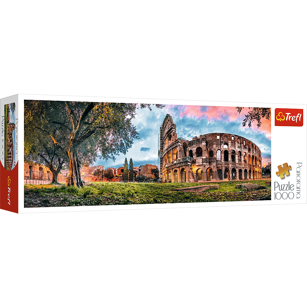 Panoramiczne puzzle 1000-elementowe ze zdjęciem przedstawiającym Koloseum o poranku. Po ułożeniu powstanie obrazek o wymiarach 97x34 cm. Wysoką jakość, nasycenie kolorów i bezpieczeństwo układania zapewnia kalandrowany papier odbijający światło, pokryty ekologicznymi farbami spożywczymi.