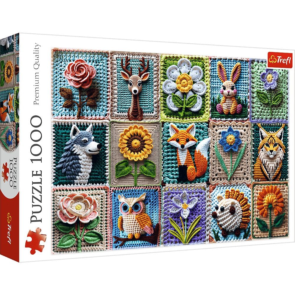 Puzzle Szydełkowanie - moja pasja, składające się z 1000 elementów, przedstawiają kolaż ze zwierzętami i kwiatami zrobionych metodą szydełkową. Po ich ułożeniu powstanie obrazek w rozmiarach 683x480 mm.