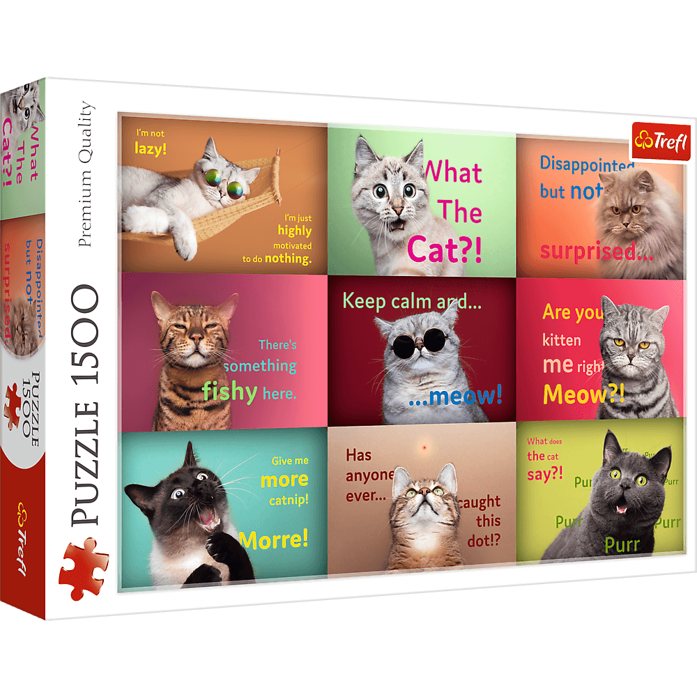 Puzzle Zabawne kocie portrety składają się z 1500 elementów i przedstawiają śmieszne memy z kotami w rolach głównych. Po ich ułożeniu powstanie obrazek o wymiarach 850x580 mm.