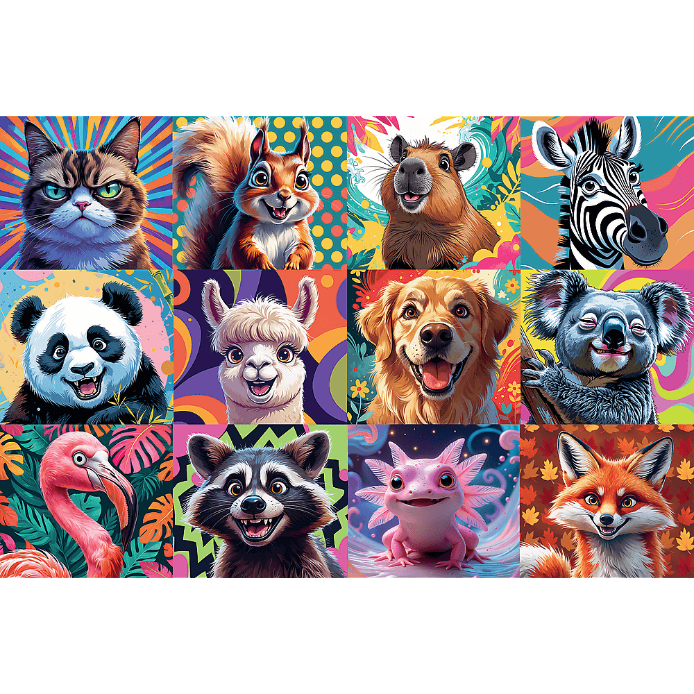 Zabawne portrety zwierząt to puzzle składające się z 300 elementów przedstawiające zabawny kolarz ze zwierzętmi.