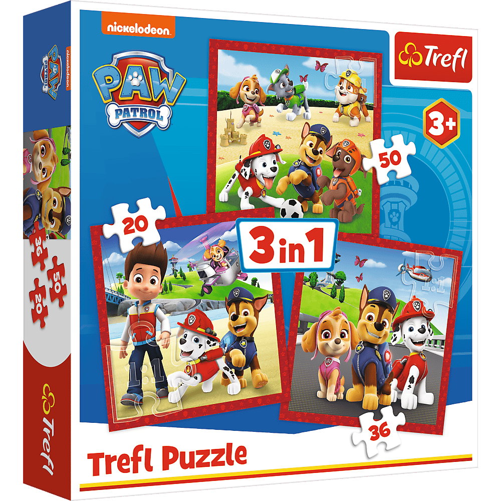 Wesołe pieski Paw Patrolto puzzle dla dzieci składające się z 3 niezaleznych ukłądanek, zaprojektowane z myślą o wszystkich fanach i fankach przygód bohaterów bajeki Paw Patrol.