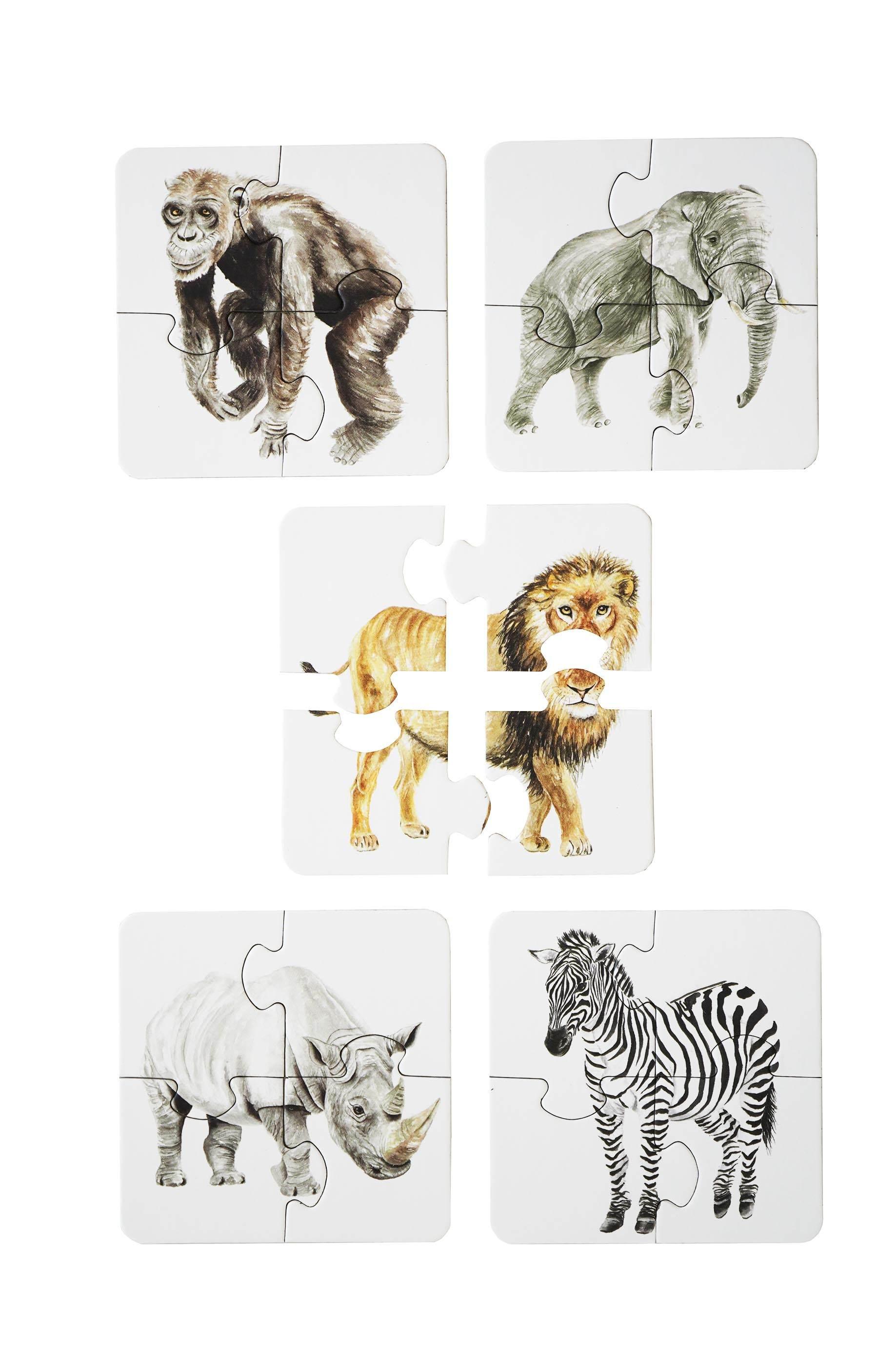 Puzzle Zwierzęta Afryki zawierają 5 układanek 4-elementowych przedstawiających lwa, słonia, nosorożca, szympansa i zebrę.