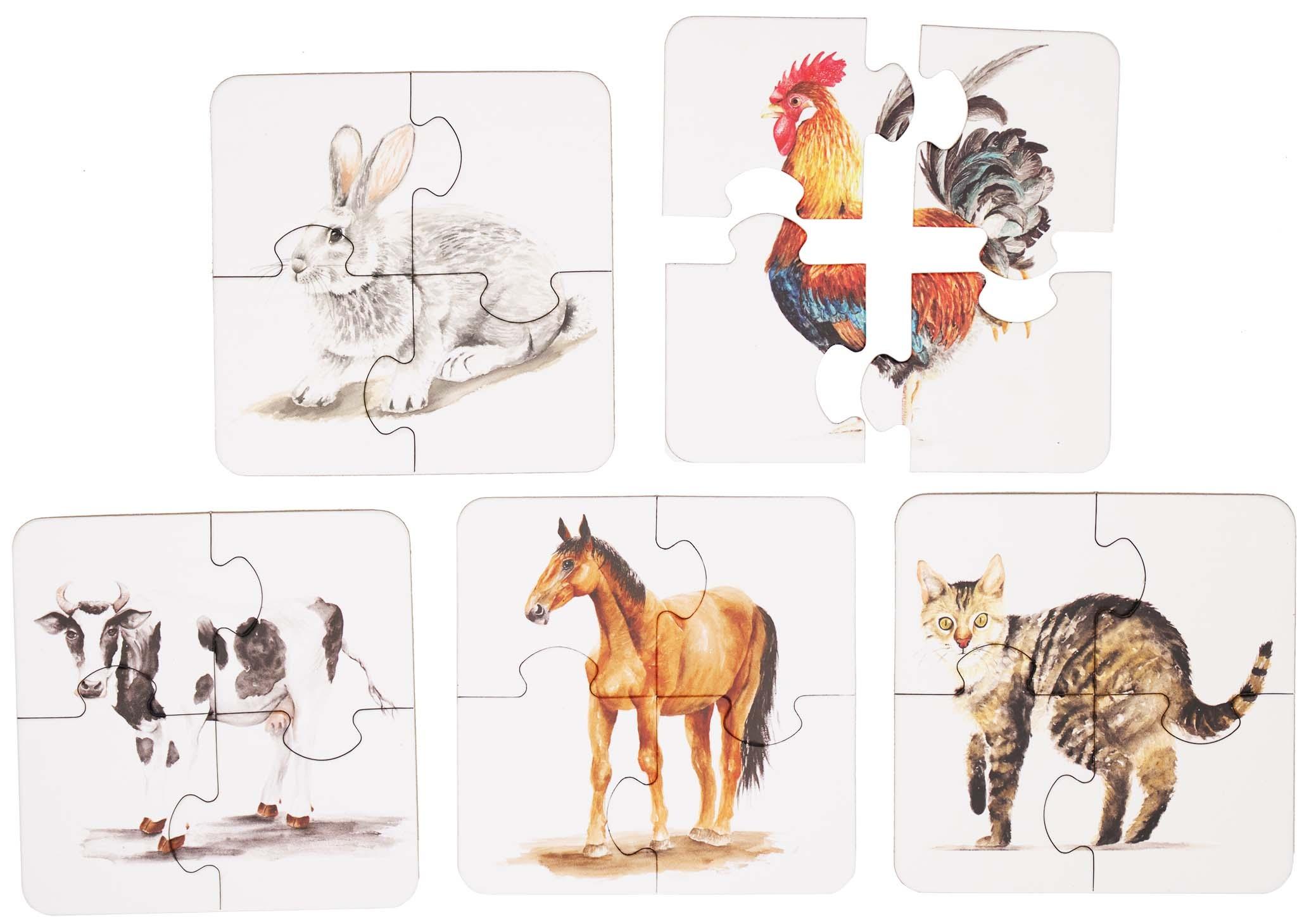 Puzzle Zwierzęta wiejskie zawierają 5 układanek 4-elementowych przedstawiających królika, konia, kota, koguta i krowę.